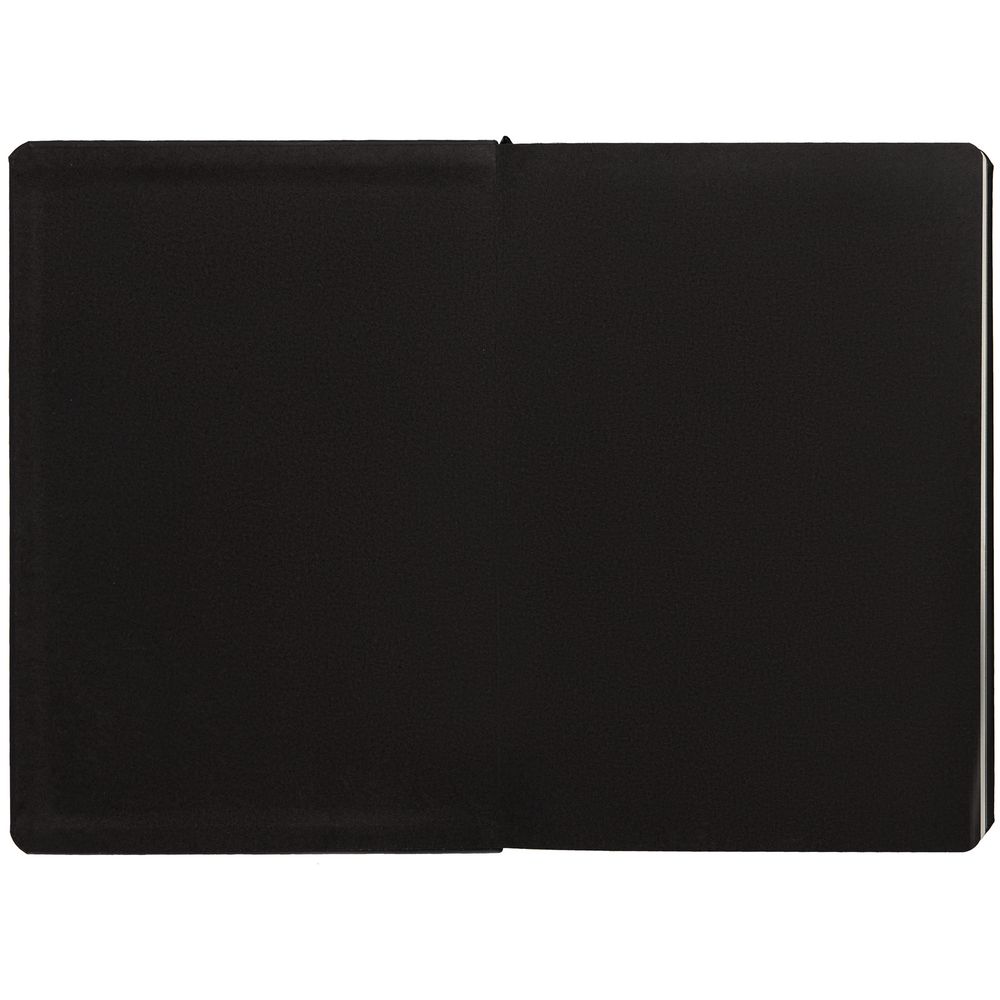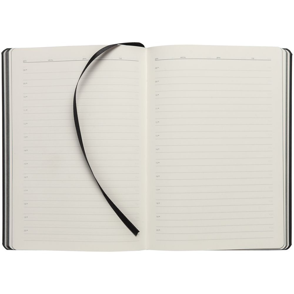 Ежедневник с твердой обложкой и тонированным обрезом, выполнен из материала Soft Touch, черный АА, дополнен ляссе в цвет обложки.