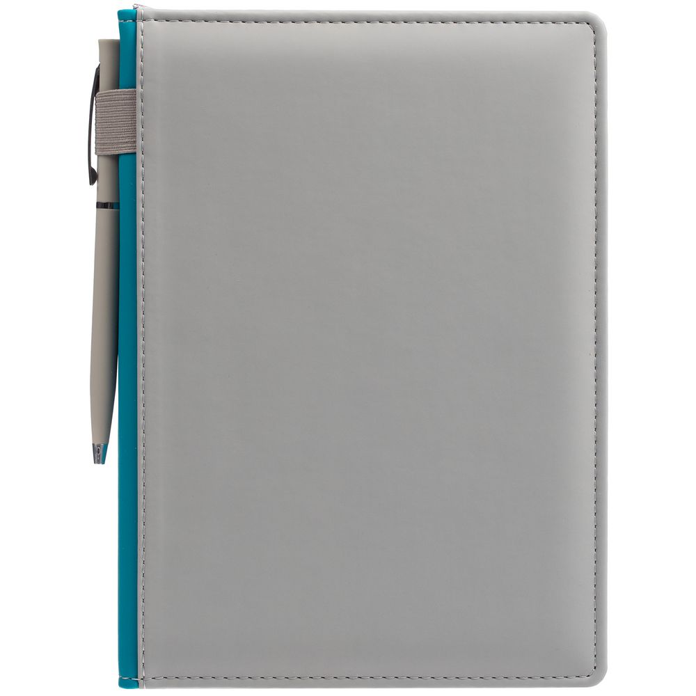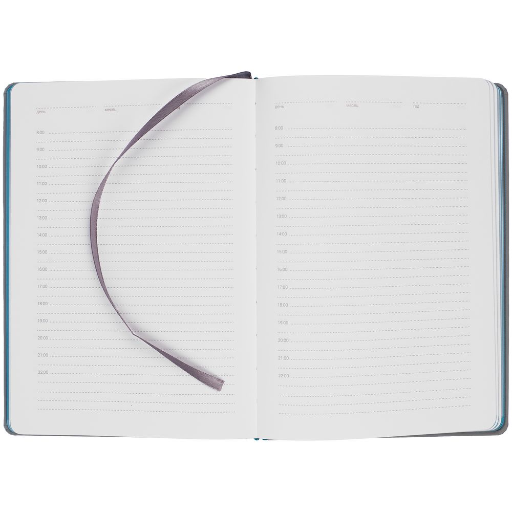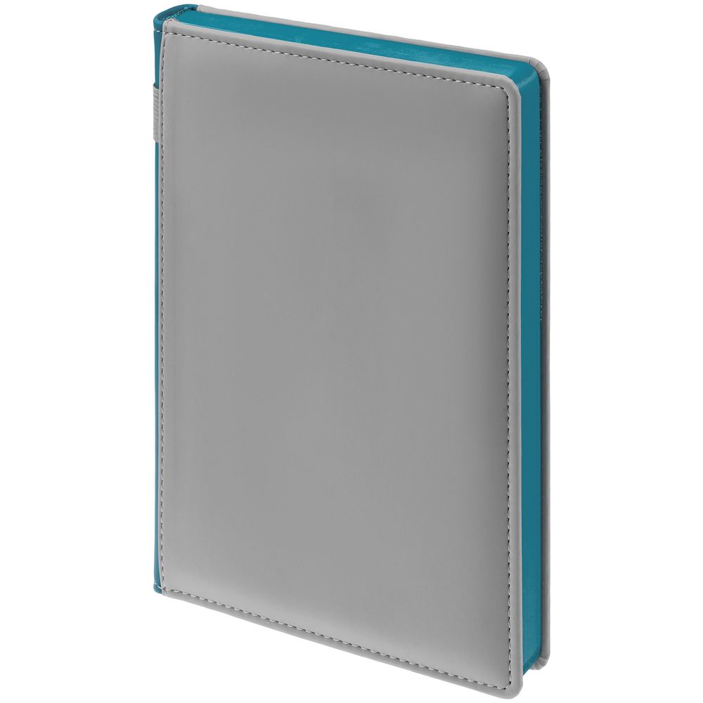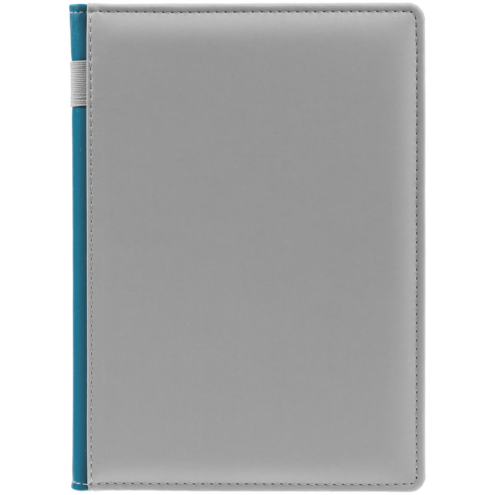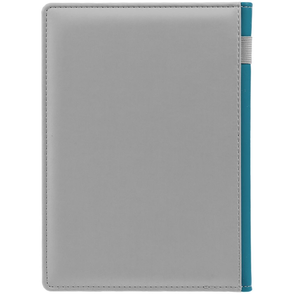 Твердая обложка с поролоном, материал обложки — Soft Touch, серый СС и Soft Touch, морская волна II. На корешке ежедневника находится петля из резинки.
