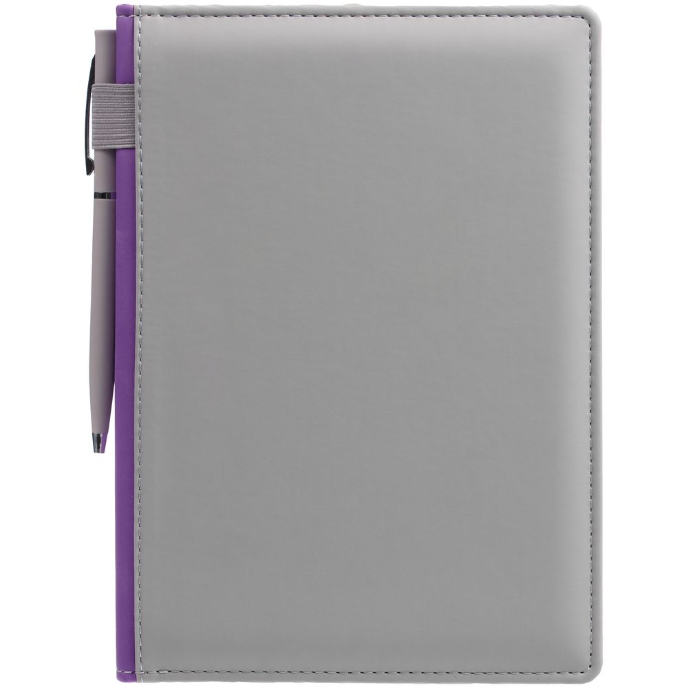 Твердая обложка с поролоном, материал обложки — Soft Touch, серый СС и Soft Touch, фиолетовый UU. На корешке ежедневника находится петля из резинки.