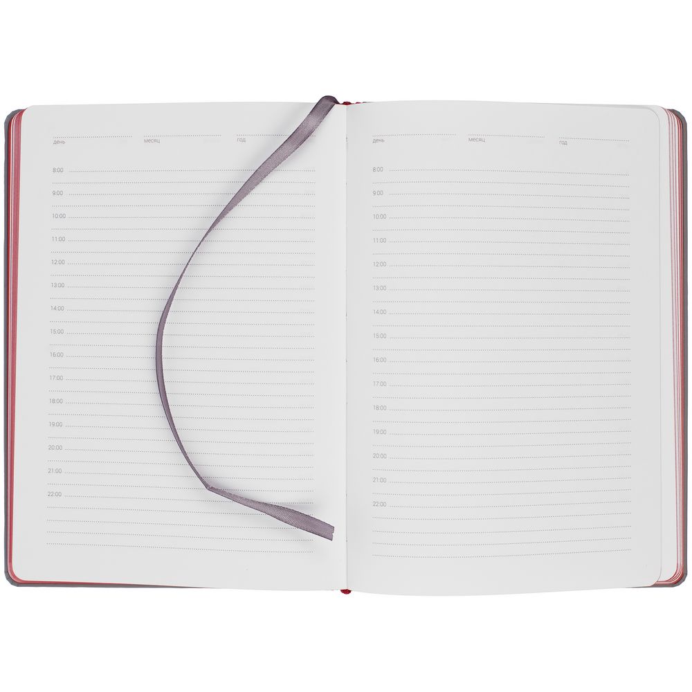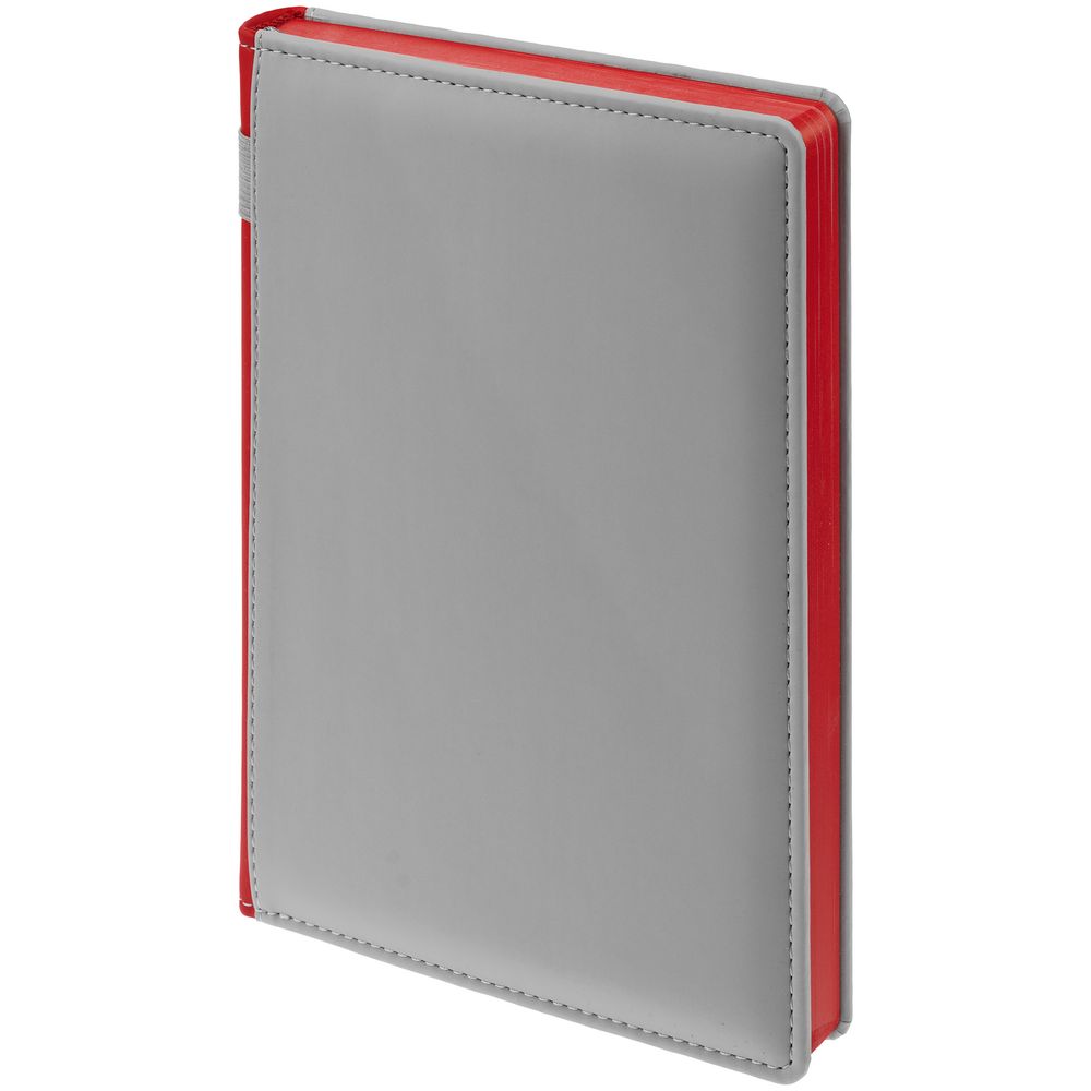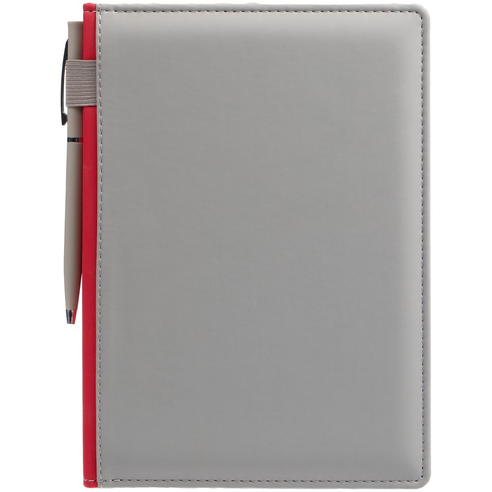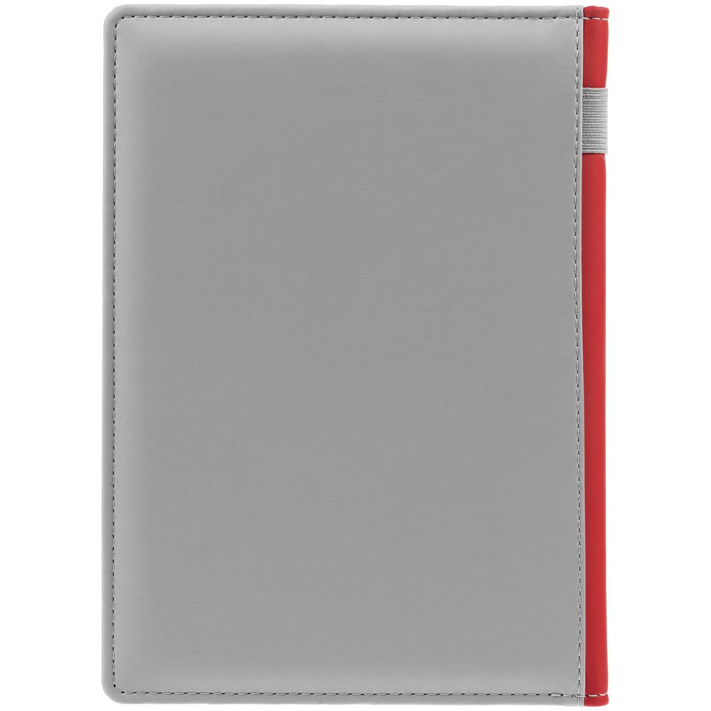 Твердая обложка с поролоном, материал обложки — Soft Touch, серый СС и Soft Touch Ultra, красный PP. На корешке ежедневника находится петля из резинки.