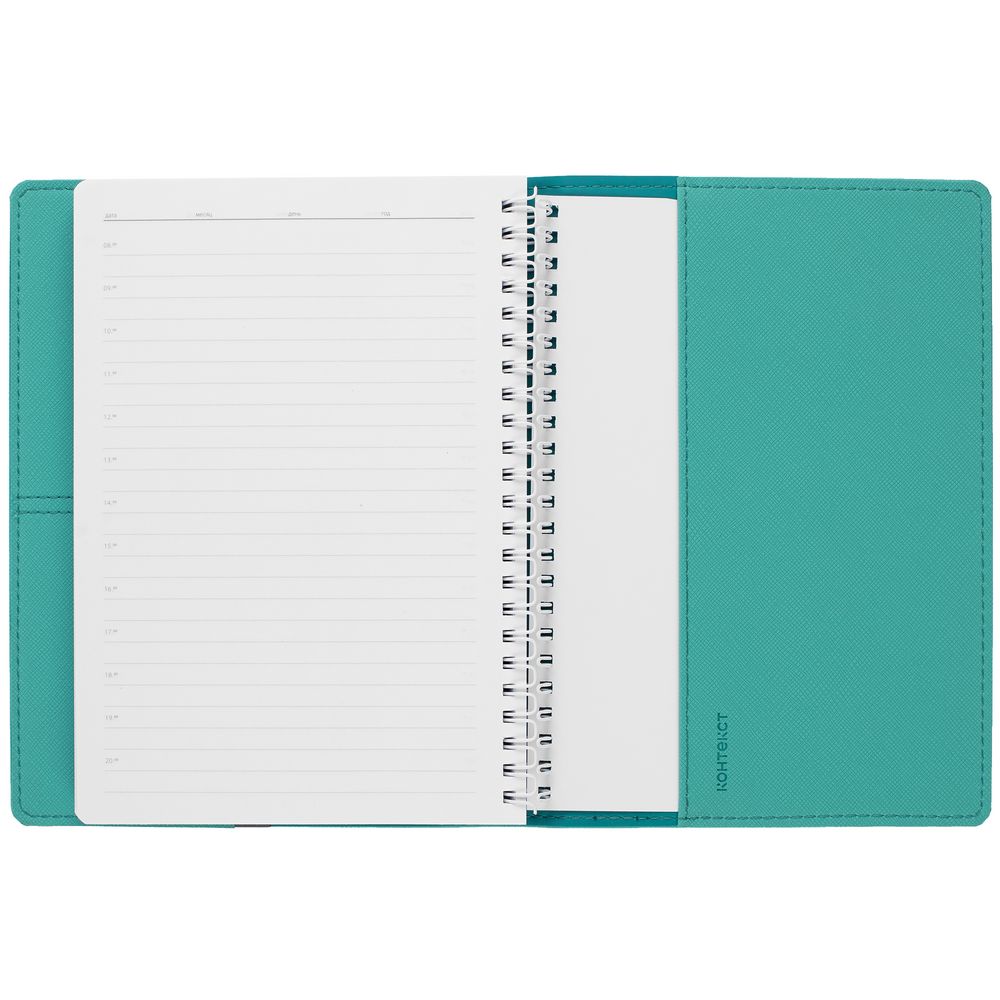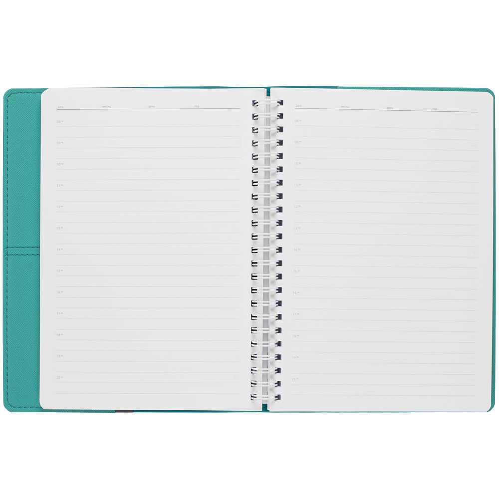 Ежедневник с блоком на пружине в твердой обложке, выполнен из материалов Nice Touch, цвет морской волны и Soft Touch Pearl серый.