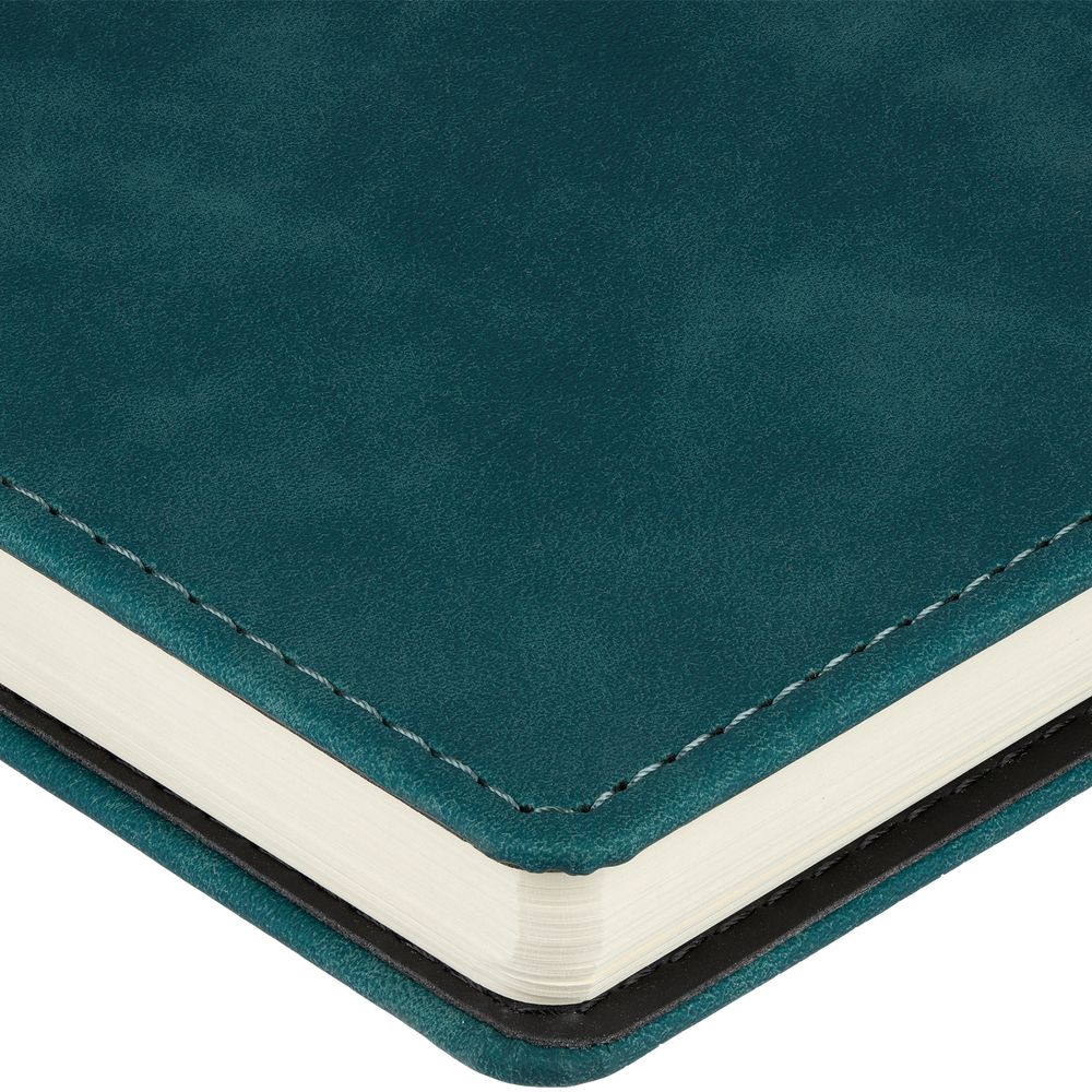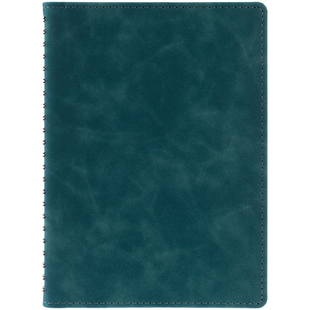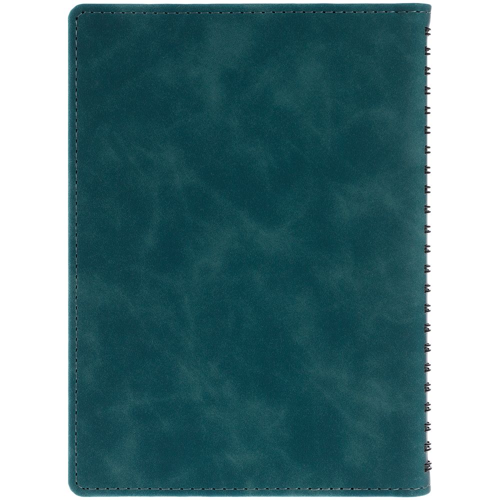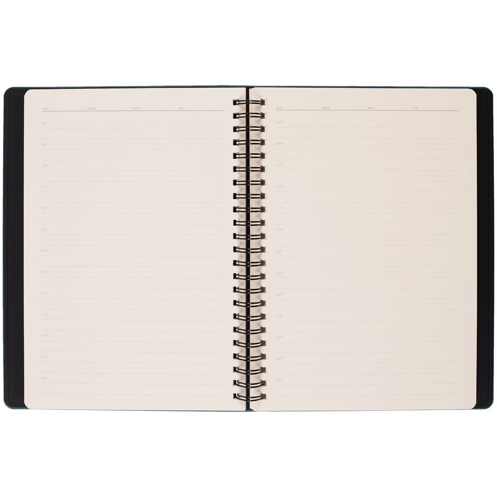 Ежедневник с блоком на пружине в твердой обложке, выполнен из материалов Nubuk Touch, темно-зеленый VV и Soft Touch, черный AA.