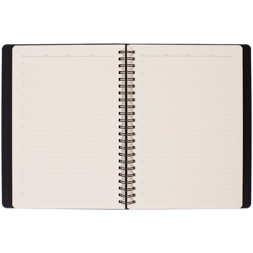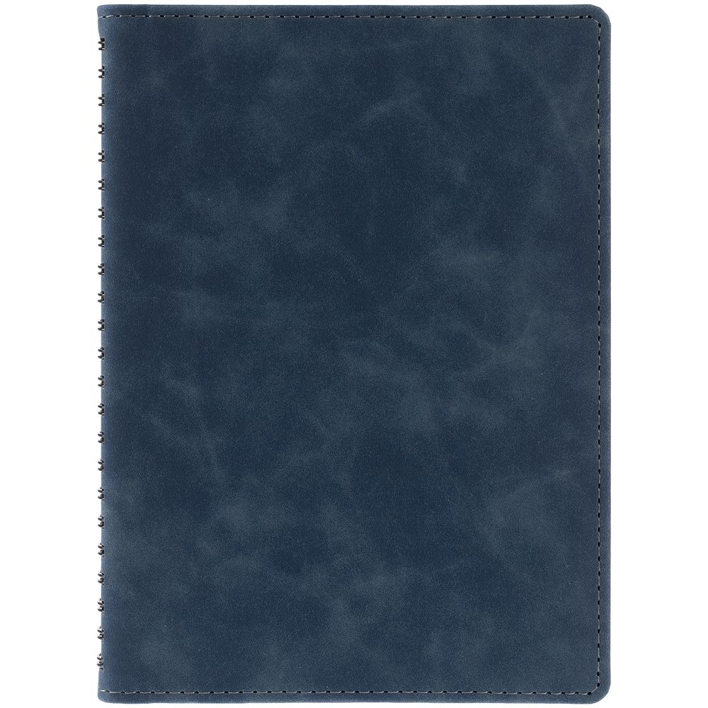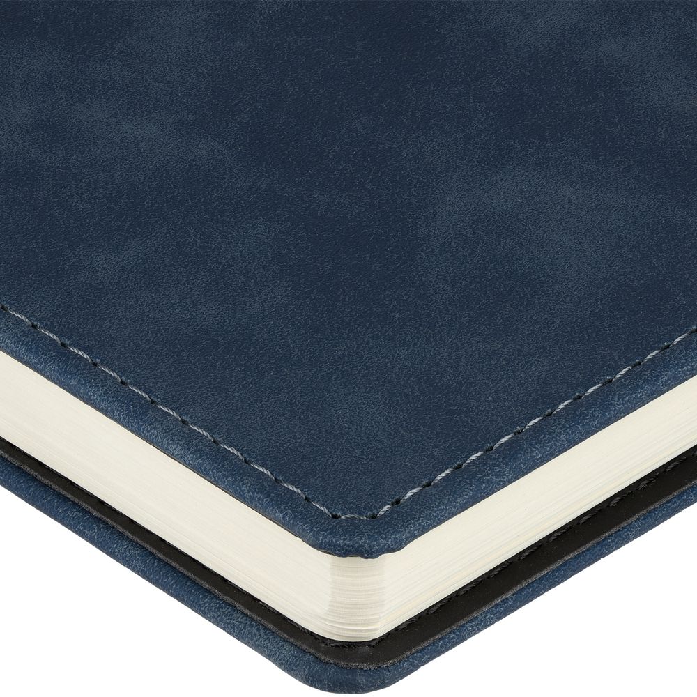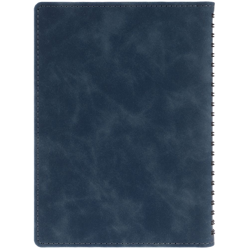 Ежедневник с блоком на пружине в твердой обложке, выполнен из материалов Nubuk Touch, темно-синий XX и Soft Touch, черный AA.
