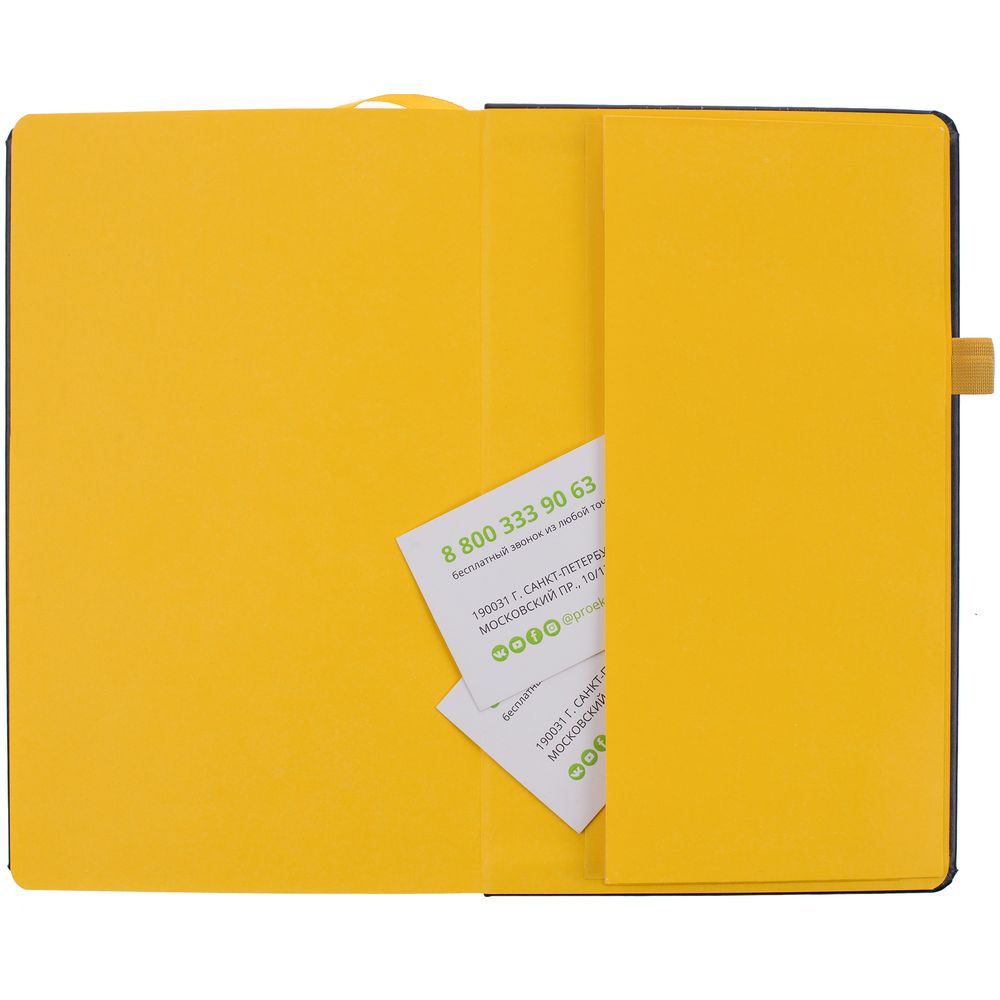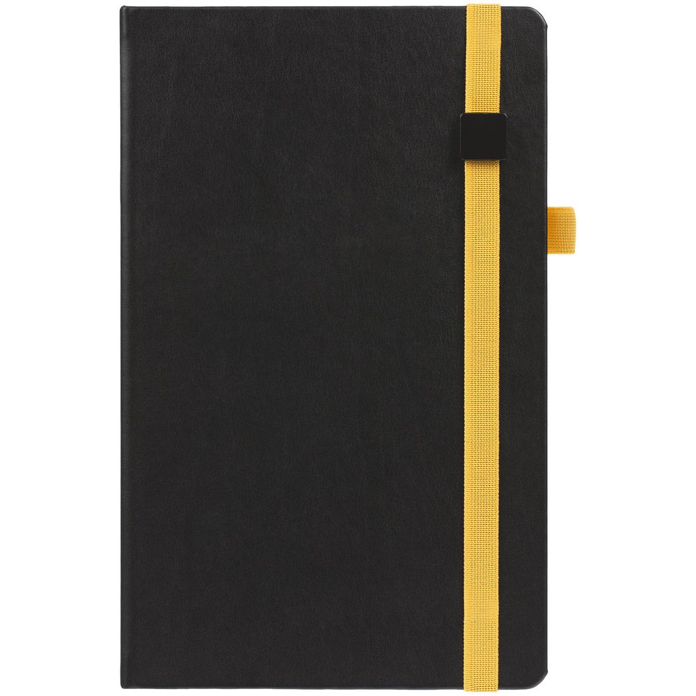 Ежедневник с полутвердой обложкой, выполнен из материала Waltz, черный АА, дополнен желтой резинкой с металлическим шильдом и ляссе.