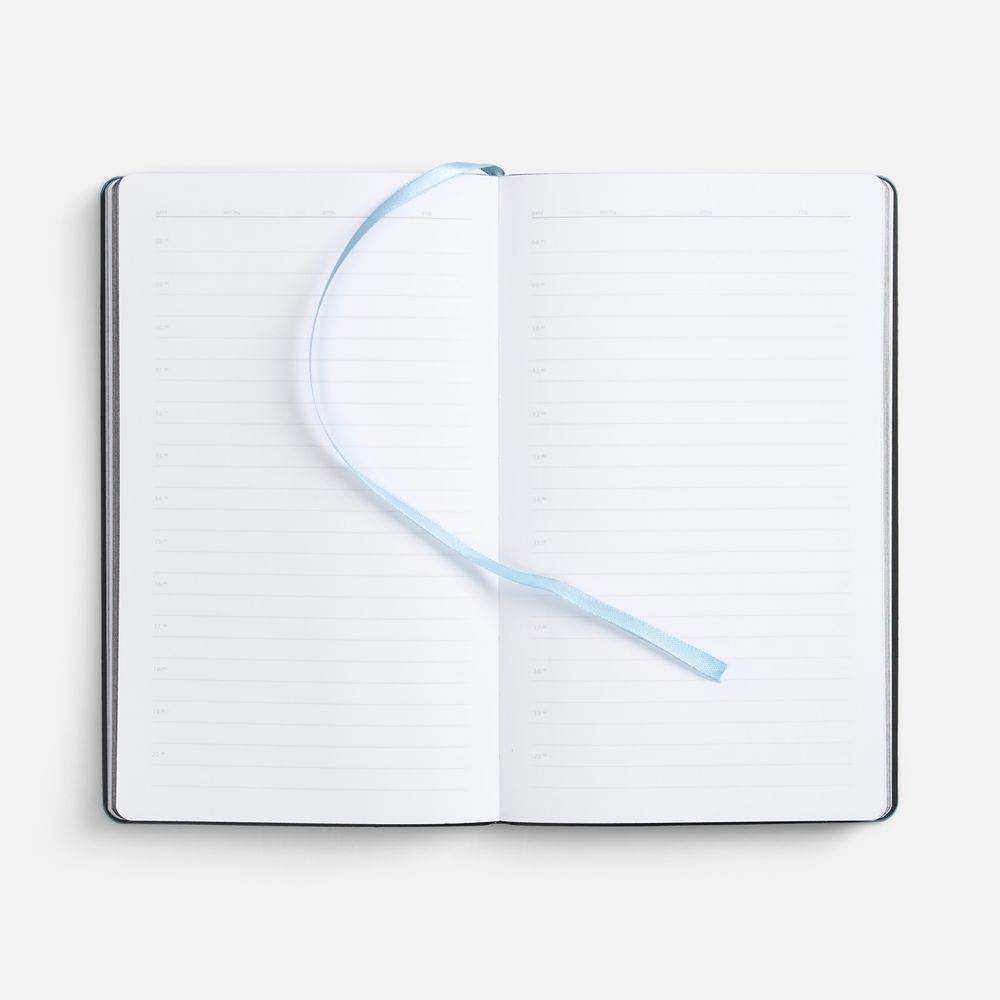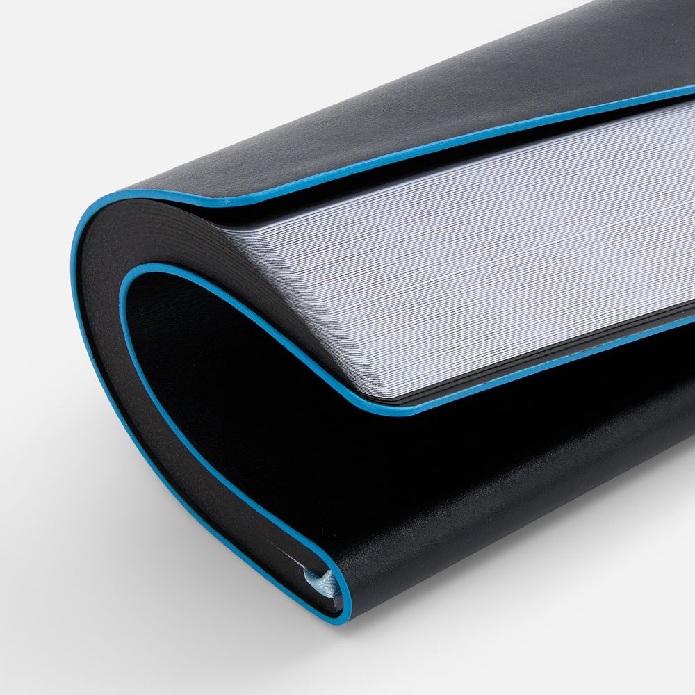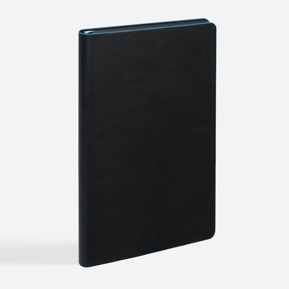 Ежедневник с гибкой обложкой, выполнен из материала Waltz, черный АА, дополнен цветными срезом обложки и ляссе.