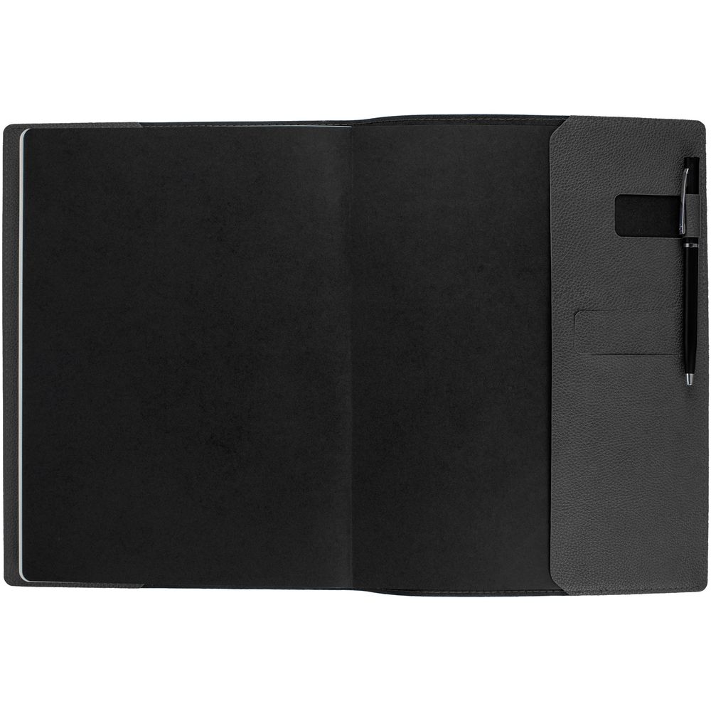 Ежедневник в суперобложке выполнен из материала La Fite, темно-серый EE, дополнен ляссе и капталом черного цвета.