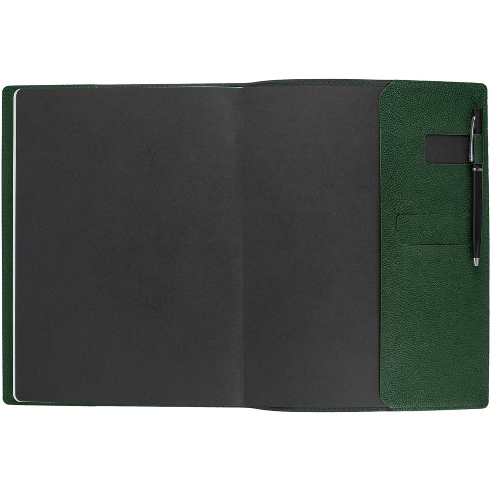 Ежедневник в суперобложке выполнен из материала La Fite, зеленый FF, дополнен ляссе и капталом черного цвета.