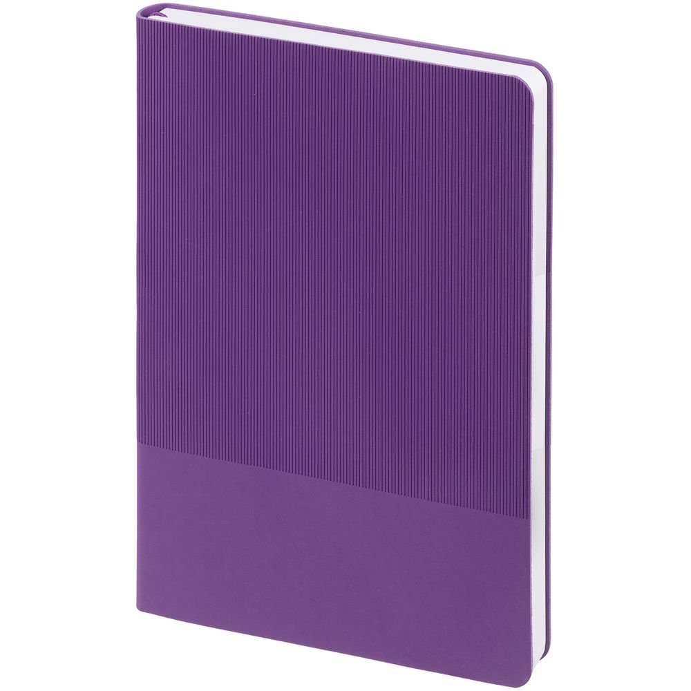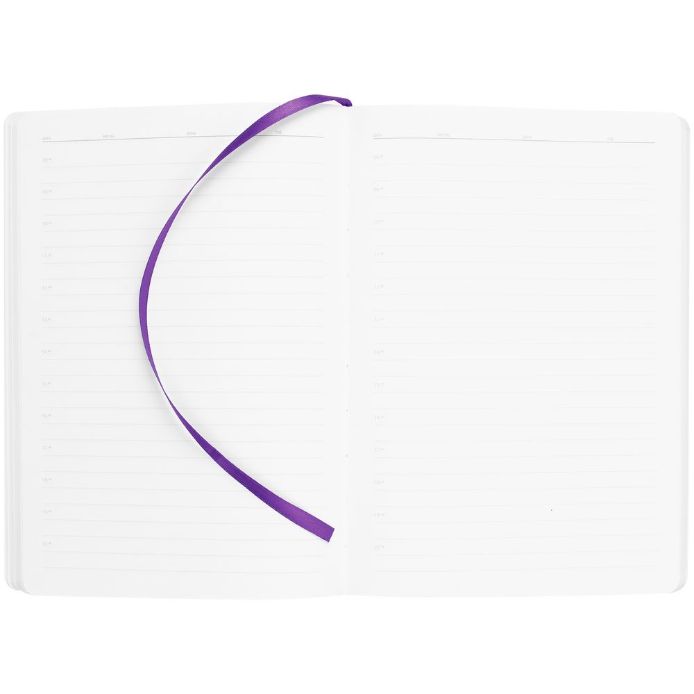 Ежедневник с гибкой обложкой выполнен из материала Soft Touch, фиолетовый UU и Latte, фиолетовый (внутренний материал); дополнен ляссе фиолетового цвета и фактурным тиснением обложки.