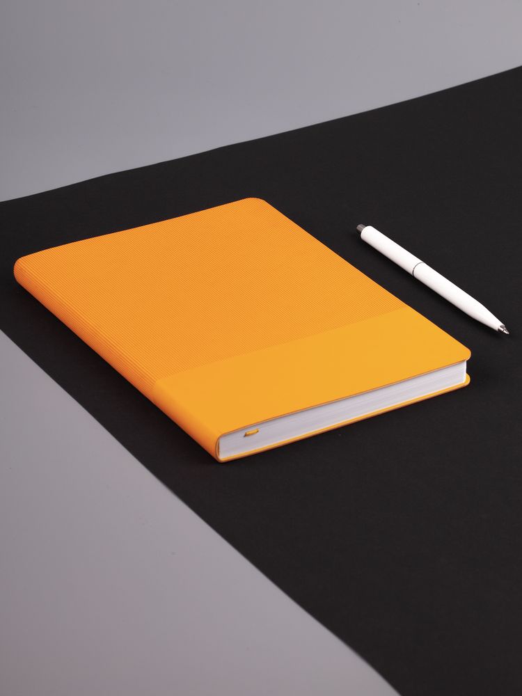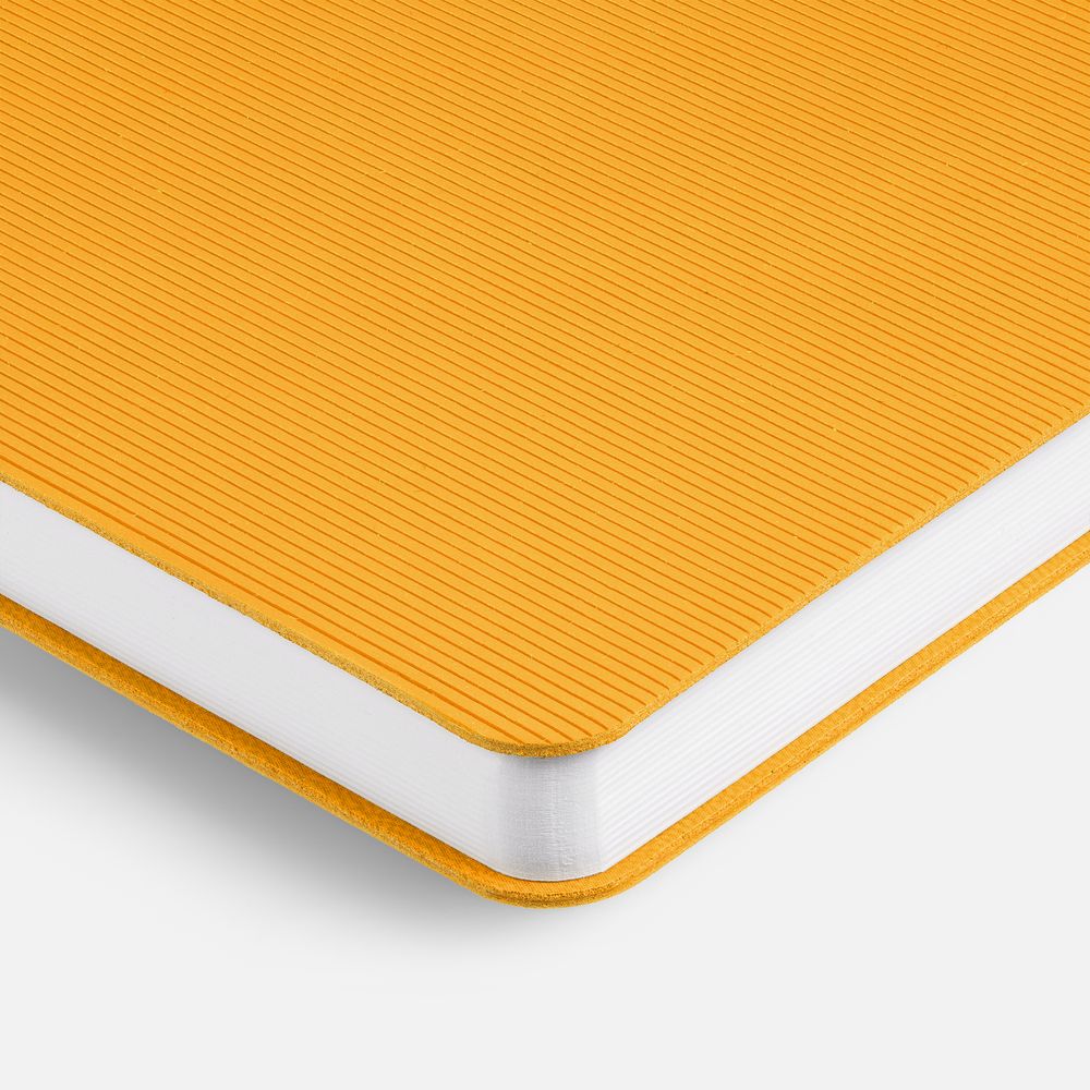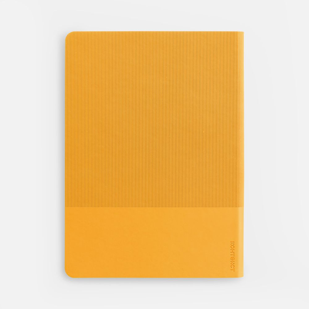 Ежедневник с гибкой обложкой выполнен из материала Soft Touch, желтый KK и Latte, желтый (внутренний материал); дополнен ляссе желтого цвета и фактурным тиснением обложки.