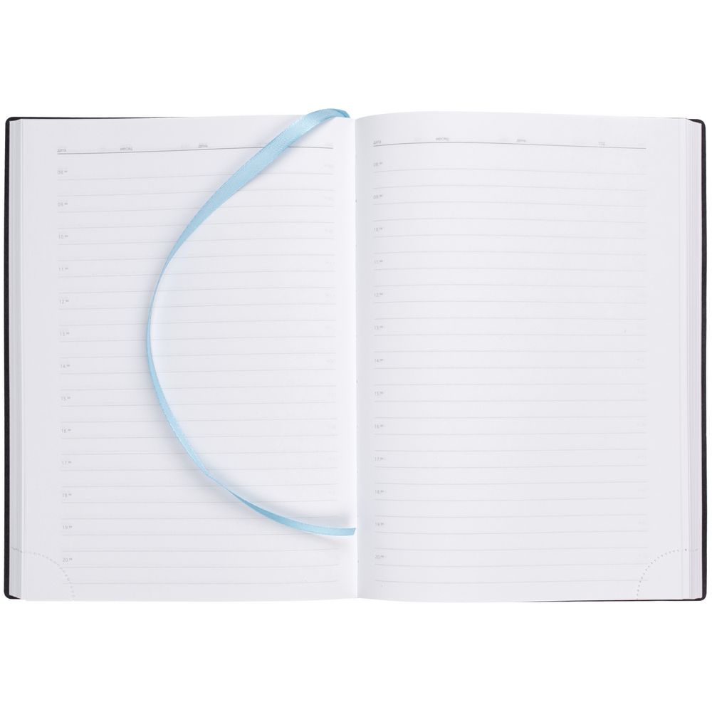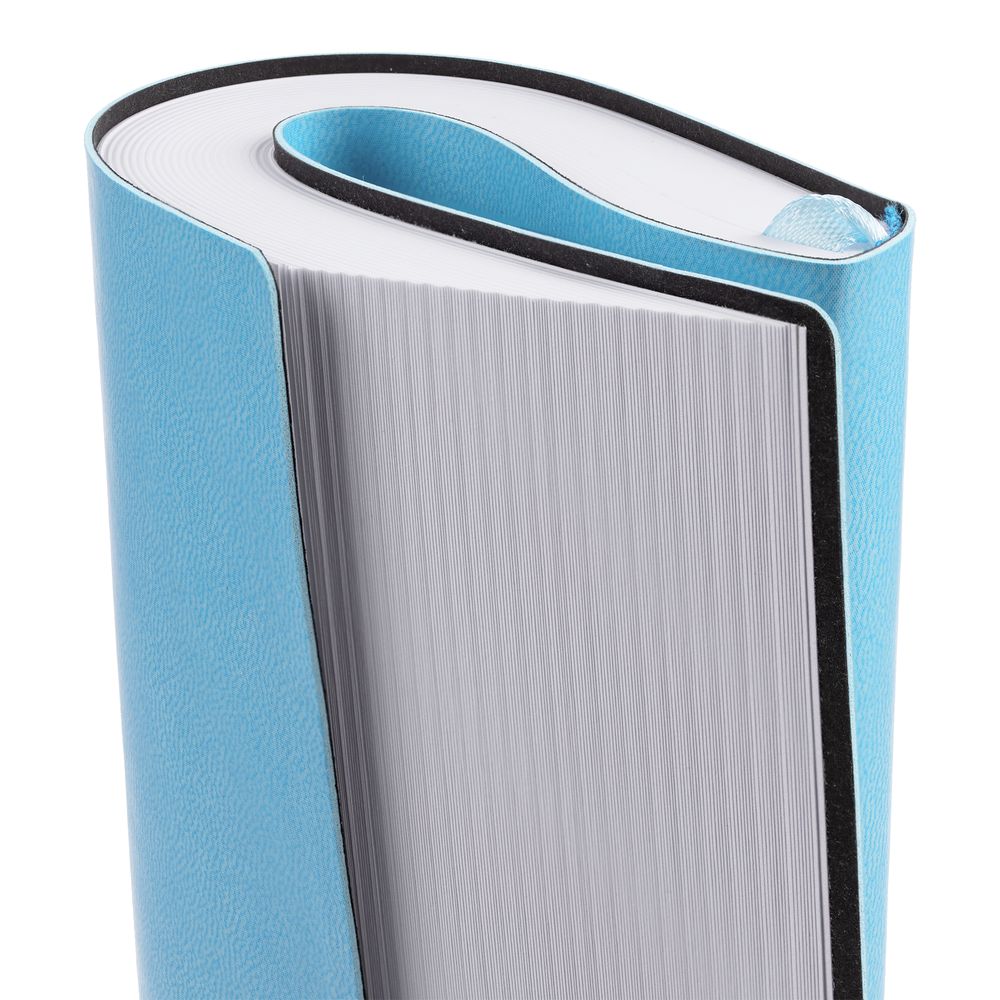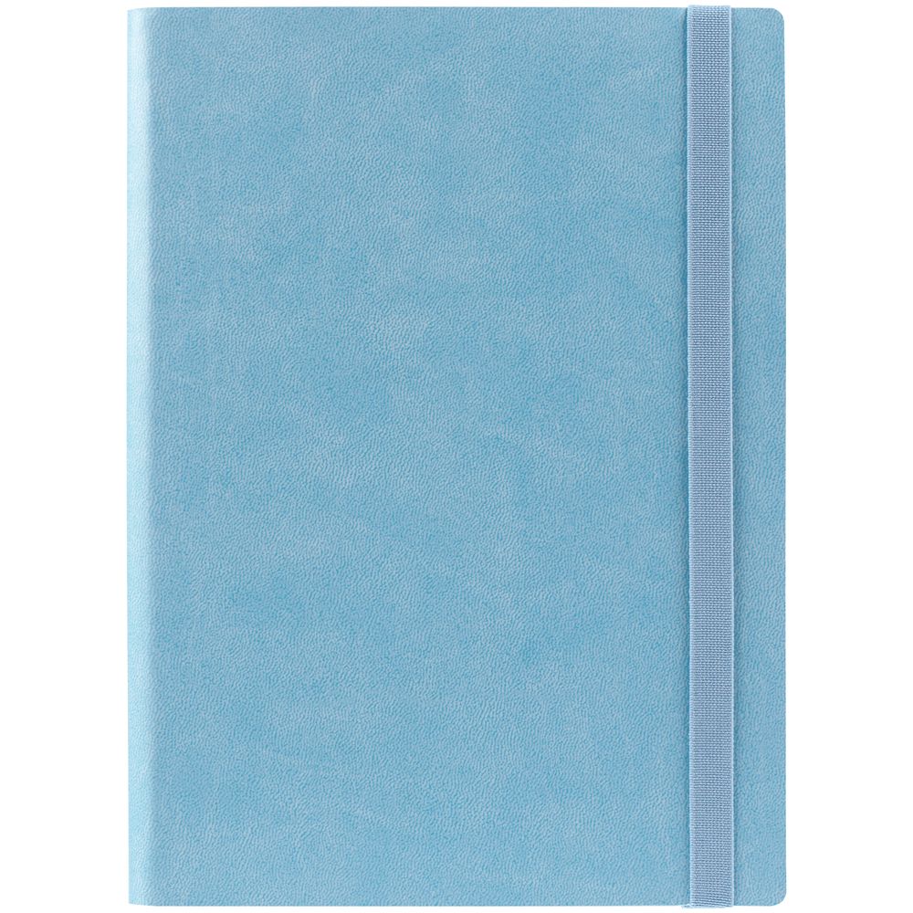 Ежедневник с гибкой обложкой выполнен из материала Latte, голубой JJ, и дополнен резинкой шириной 1 см, капталом и ляссе голубого цвета.