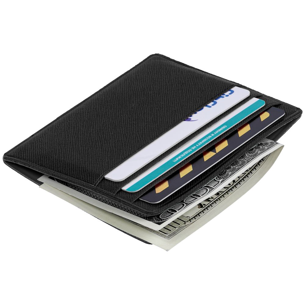 Чехол для карточек из искусственного материала, имитирующего сафьяновую кожу, с шестью отделениями для кредитных карт и одним — для сложенных купюр.