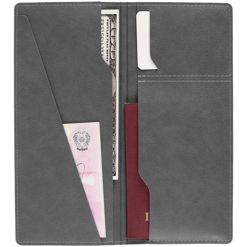 Имеет 5 отделений: для билетов, паспорта, визиток или кредитных карт.