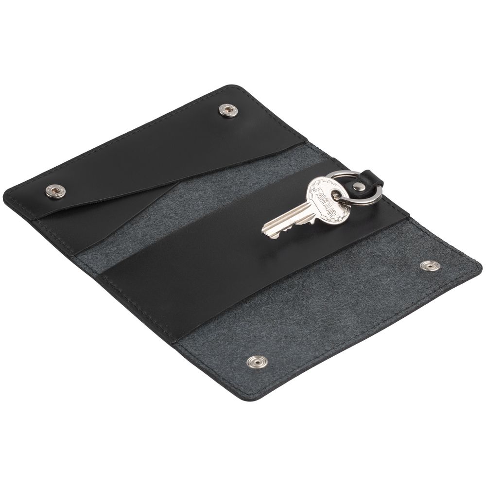 Внутри кольцо для крепления ключей длиной до 12 см. Застегивается на кнопки.