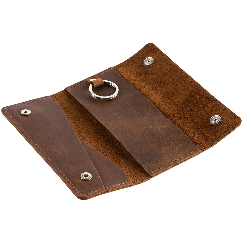 Ключница изготовлена из плотной и прочной натуральной кожи Crazy Horse. На ее поверхности довольно быстро появляется неповторимый рисунок из потертостей и складок — следы времени придают материалу изысканный винтажный вид, делая каждый предмет уникальным в своем роде. Так изделия, подобно благородным напиткам, со временем приобретают лишь большую ценность.