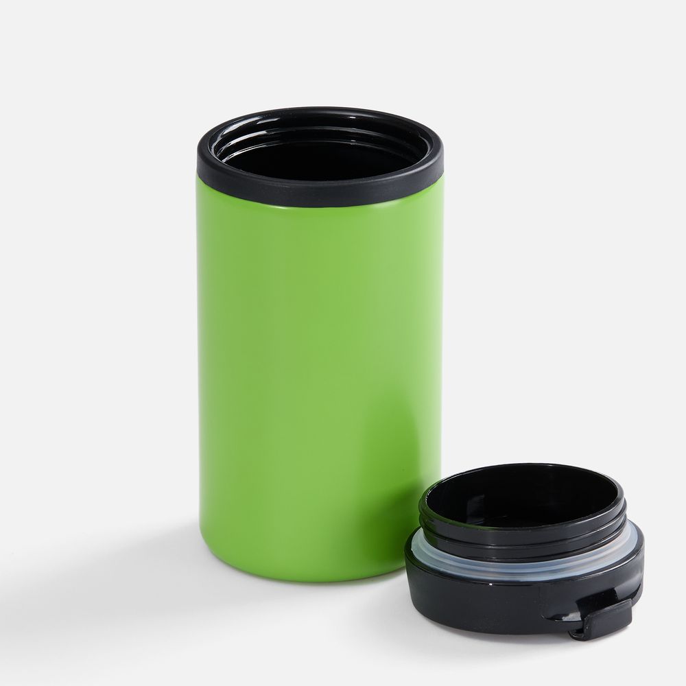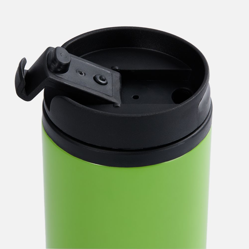 Двухслойная конструкция из пищевого пластика внутри и нержавеющей стали снаружи. Герметичная завинчивающаяся крышка с откидным клапаном для питья.