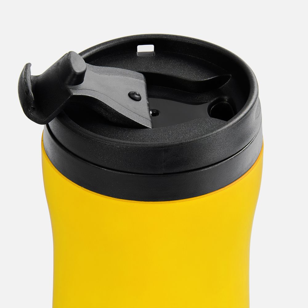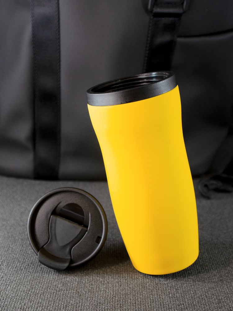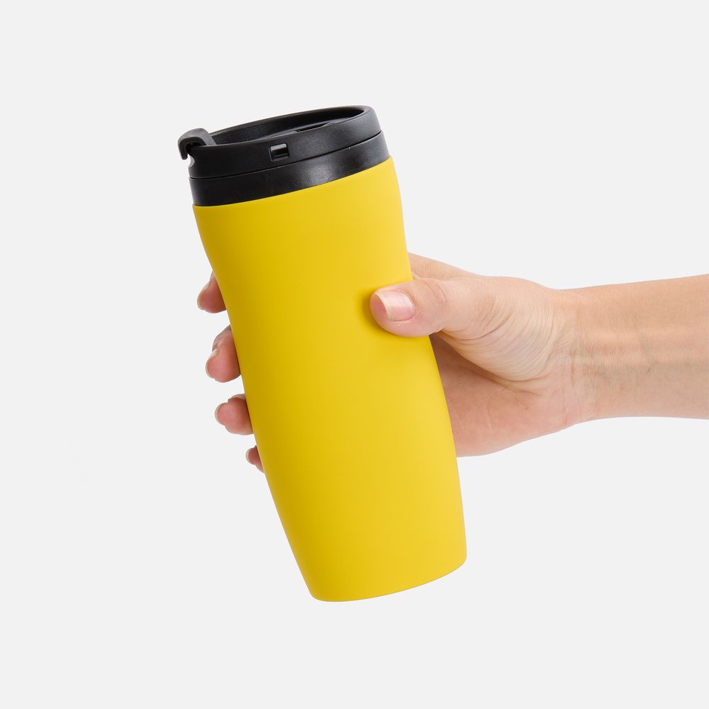 Двухслойная конструкция из нержавеющей стали снаружи и пищевого пластика внутри. Герметичная завинчивающаяся крышка с откидным клапаном для питья. Покрытие софт-тач. В отверстие в крышке можно вставить шнурок для удобного ношения стакана на руке. Шнурок в комплект не входит.