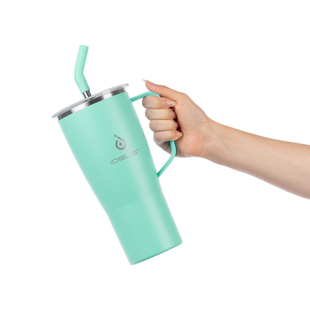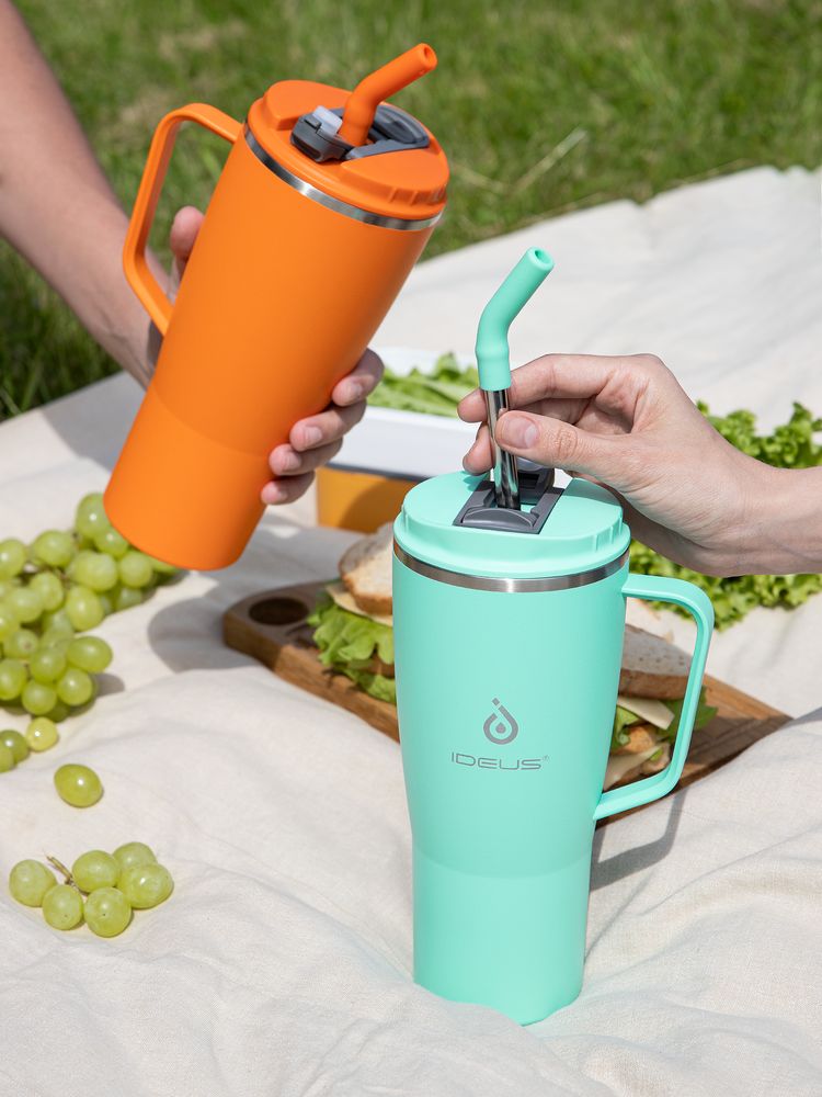- 2 крышки в комплекте: одна на 100% герметичная с механизмом блокировки отверстия для питья, вторая — с отверстием для трубочки