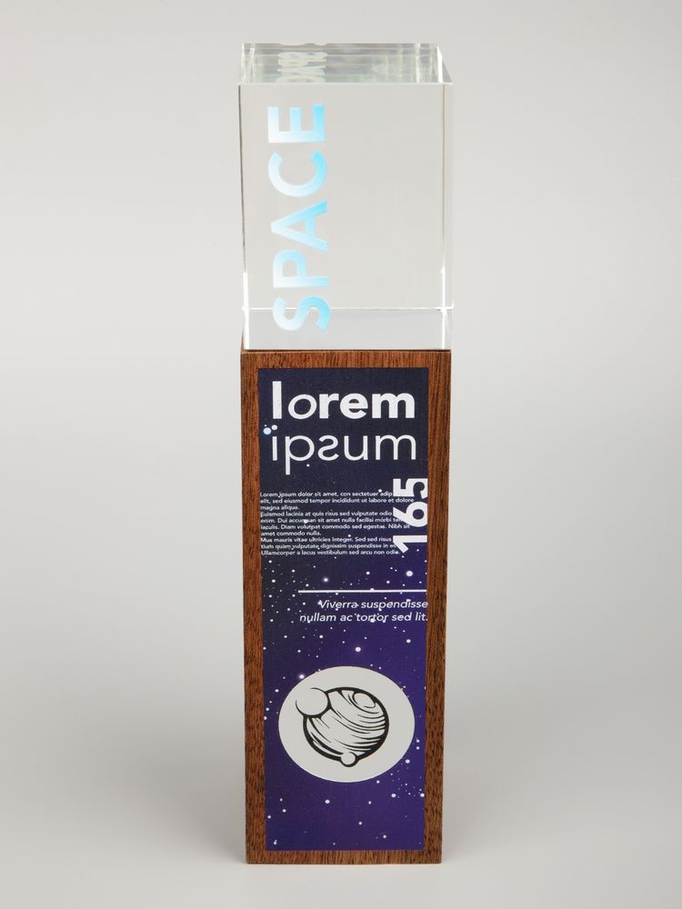 Навершие изготовлено из стекла К9, в основе которого лежит оптическое боросиликатное стекло. Эту марку стекла отличает низкий процент посторонних включений, высокий показатель преломления и высокая прозрачность — идеальные качества для изготовления наград премиального уровня.