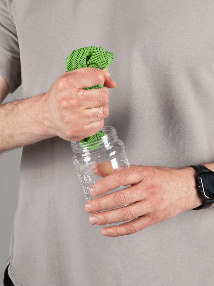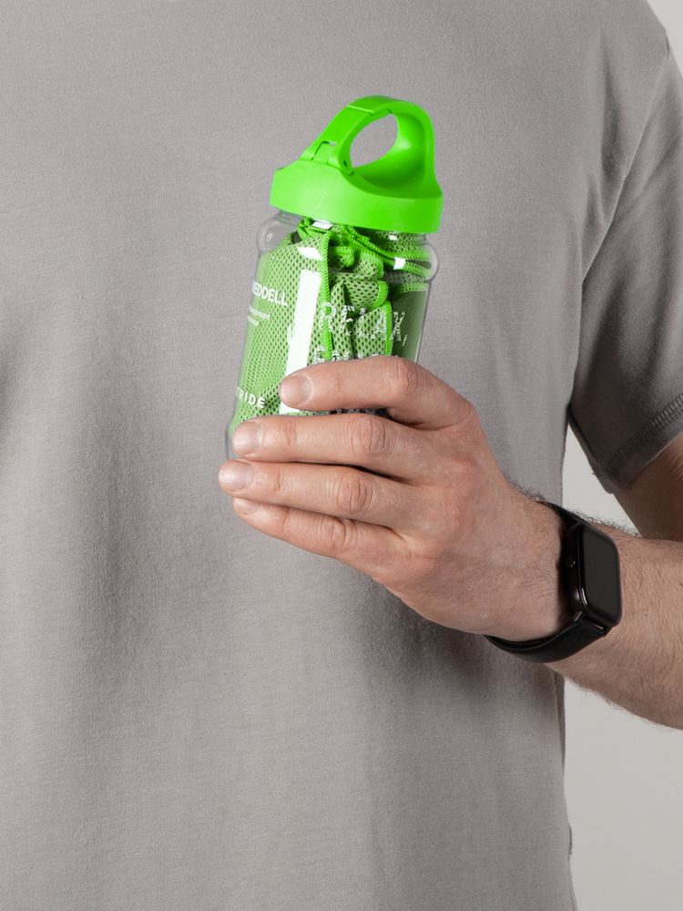 При хранении в бутылке полотенце сохранит охлаждающий эффект в течение нескольких часов. Благодаря крышке-карабину ее удобно прицепить на рюкзак или сумку.