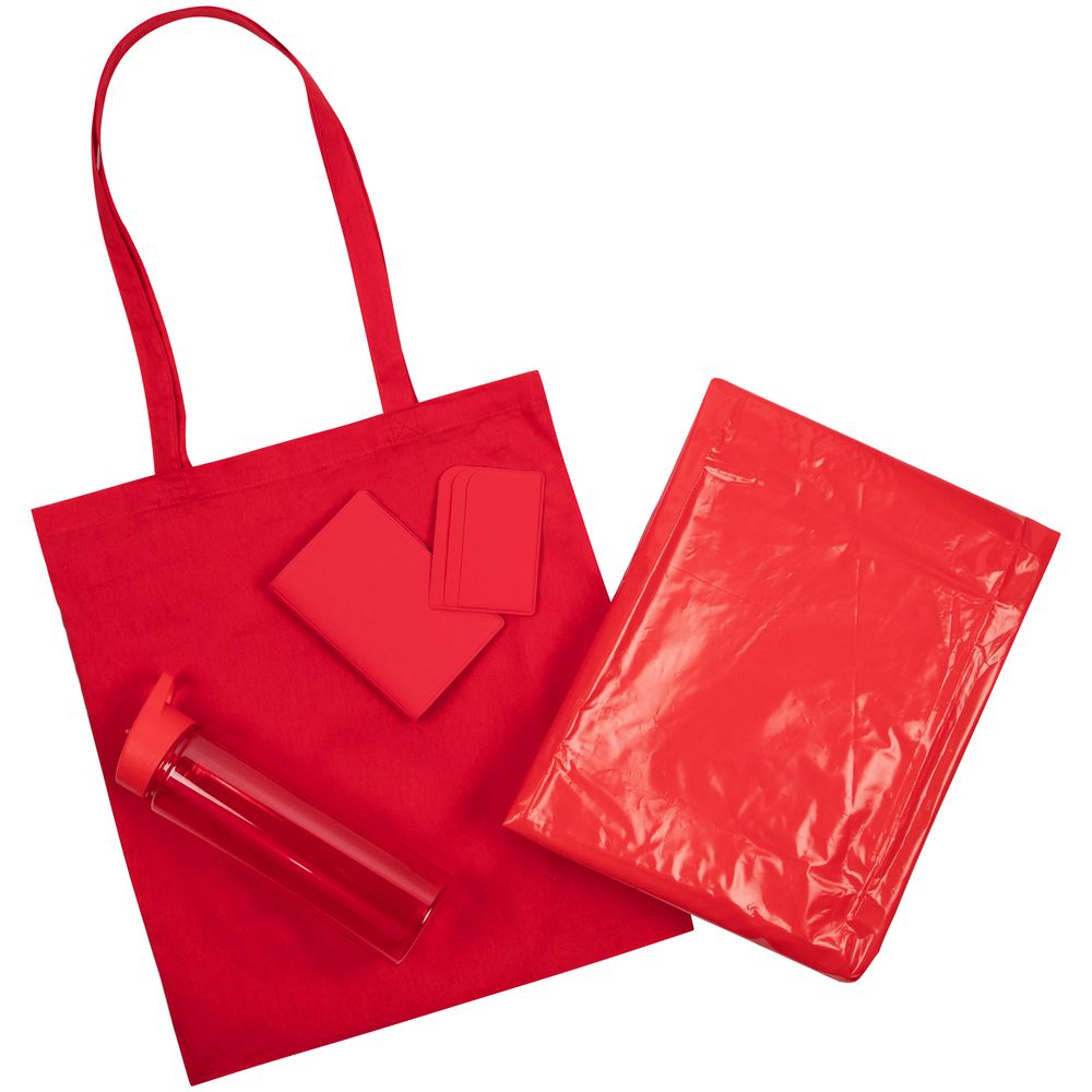 Большая спортивная бутылка для поддержания водного баланса, стильные личные аксессуары на каждый день и конечно, необходимый атрибут выездных мероприятий — плотный пластиковый дождевик-плащ с капюшоном. Все это собрано в идеальной упаковке — базовом тонком шопере, который может пригодиться на мастер-классе по рисованию на ткани.