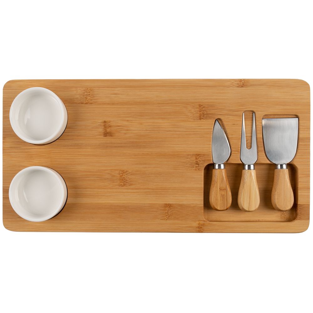 В набор входят доска из бамбука, два керамических соусника, вилка, листовидный нож для сыра твердых сортов, нож-лопатка для мягкого сыра.