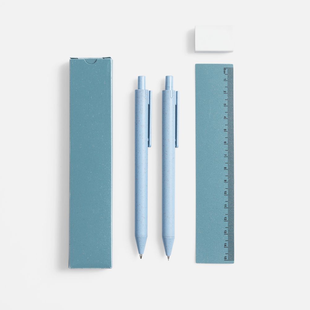 - В комплекте ручка, механический карандаш, линейка, ластик и упаковка.