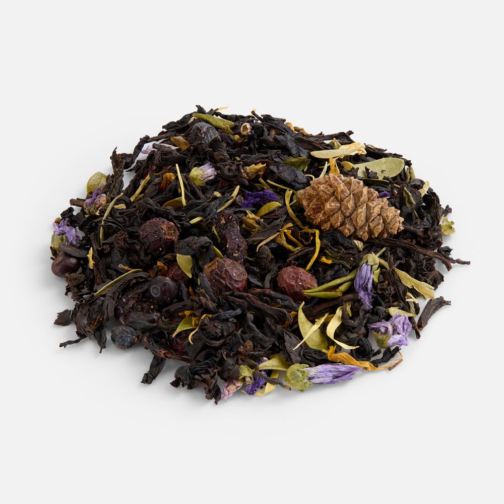 За ягодный вкус отвечают сублимированные малина и смородина, усиленные ароматом черной смородины. Лепестки календулы и мальвы придают настою солнечный оттенок и цветочное послевкусие. Идеальный баланс между тонизирующим эффектом и ягодной сладостью.Состав: чай черный, плоды боярышника, клюква, листья брусники, плоды можжевельника, мята, сосновые шишки, розмарин, листья саган-дайля, лепестки календулы, малина, сублимированная, красная смородина сублимированная, цветки мальвы, ароматизатор «Черная смородина».