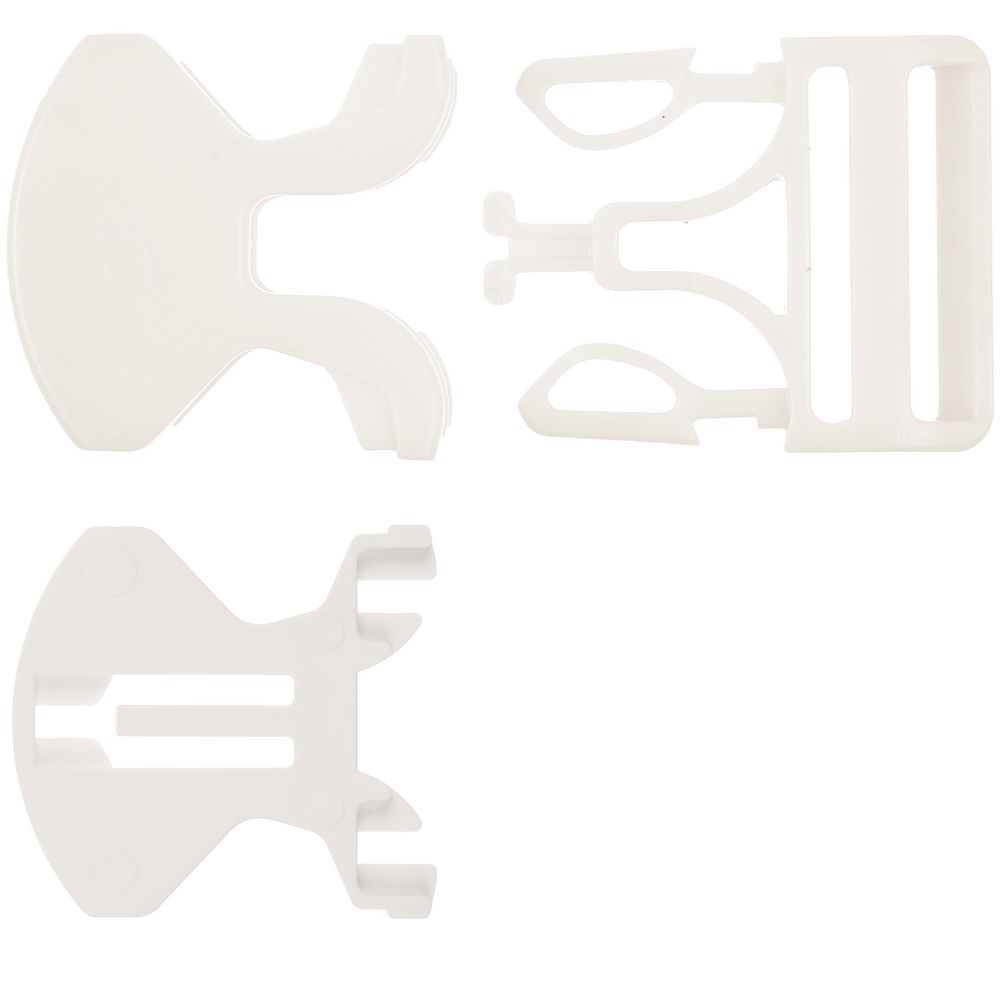 Особенность этой пряжки в том, что она состоит из 3 частей, две из которых крепятся напрямую на изделие, и для их установки необходим специальный инструмент. Третья деталь фиксируется на стропе.