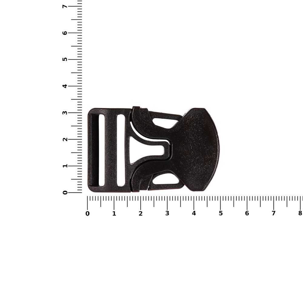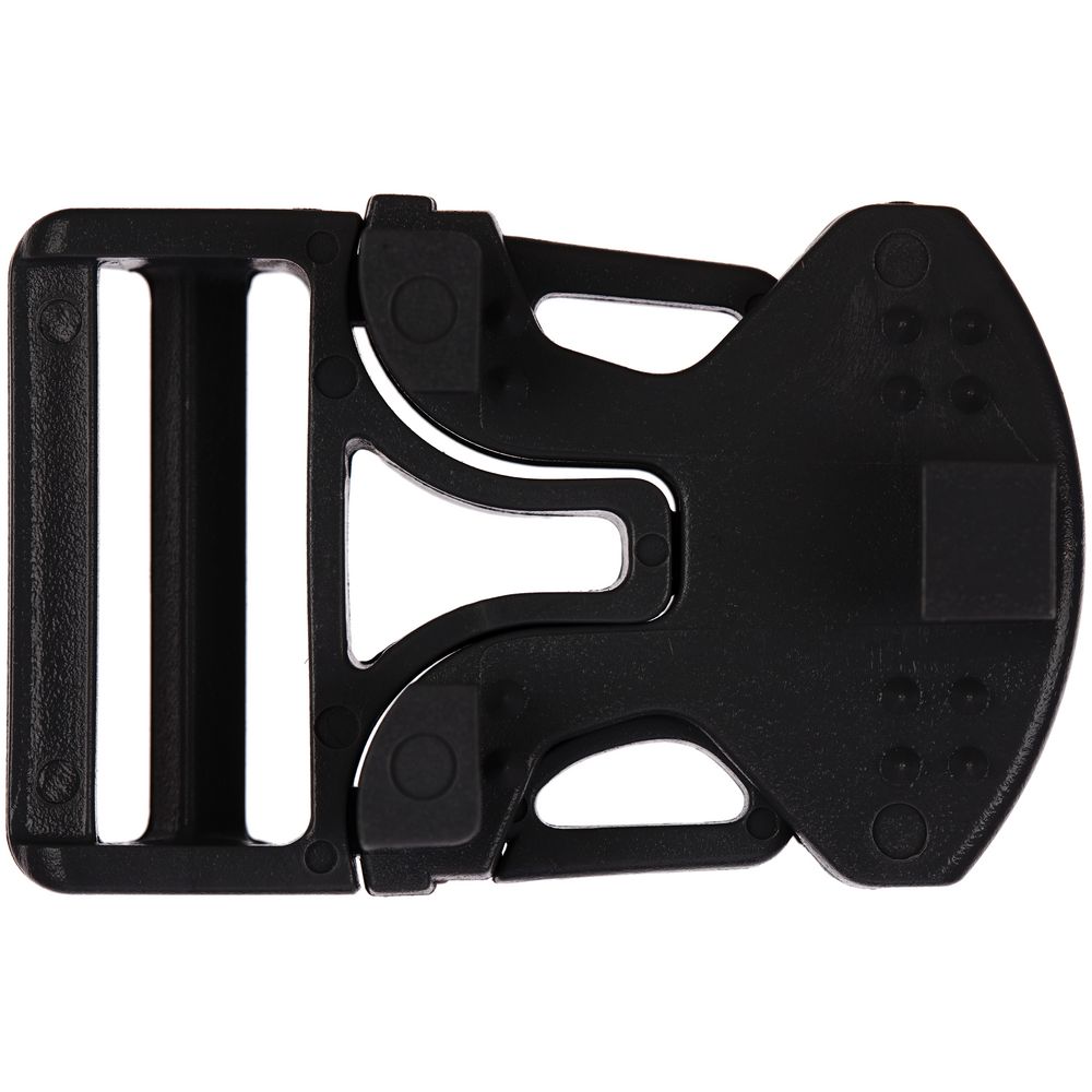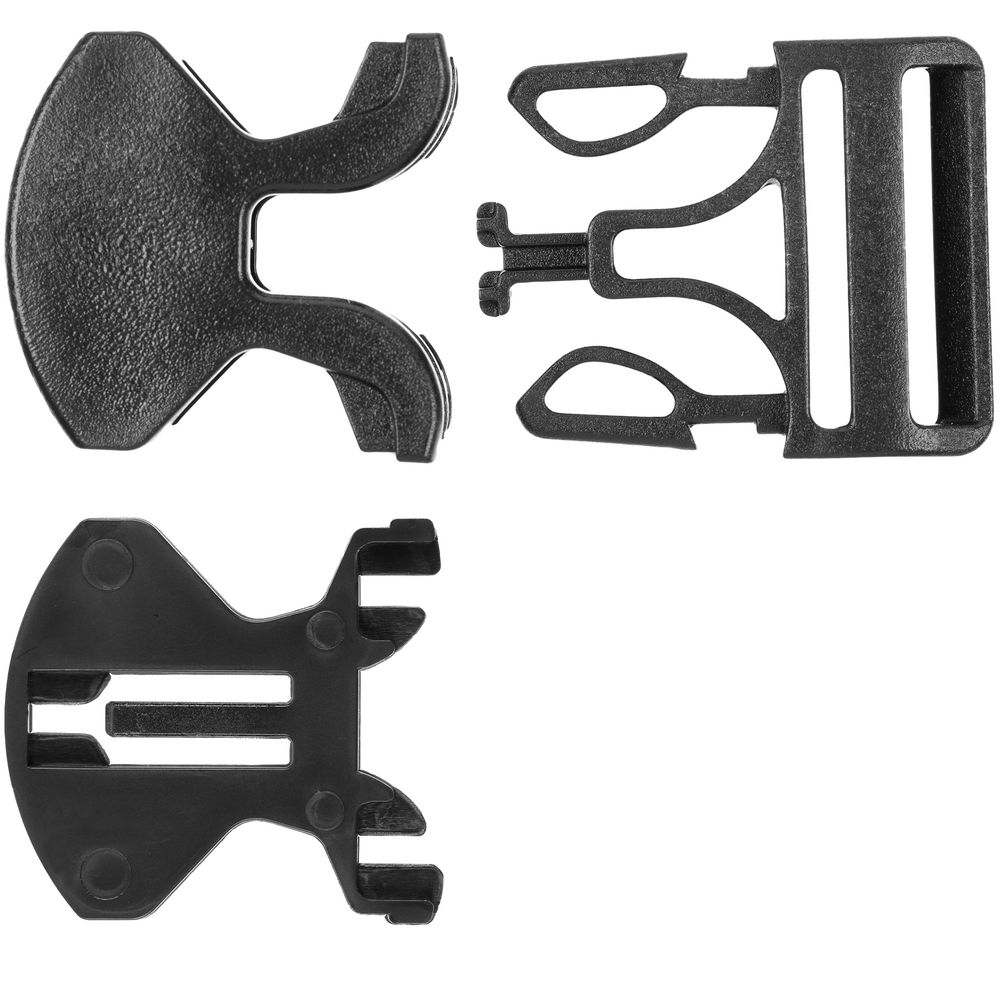 Особенность этой пряжки в том, что она состоит из 3 частей, две из которых крепятся напрямую на изделие, и для их установки необходим специальный инструмент. Третья деталь фиксируется на стропе.
