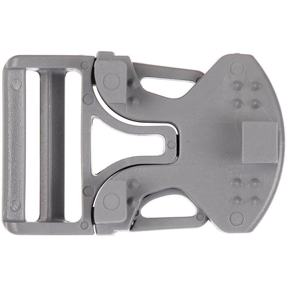Особенность этой пряжки в том, что она состоит из 3 частей, две из которых крепятся напрямую на изделие, и для их установки необходим специальный инструмент. Третья деталь фиксируется на стропе.