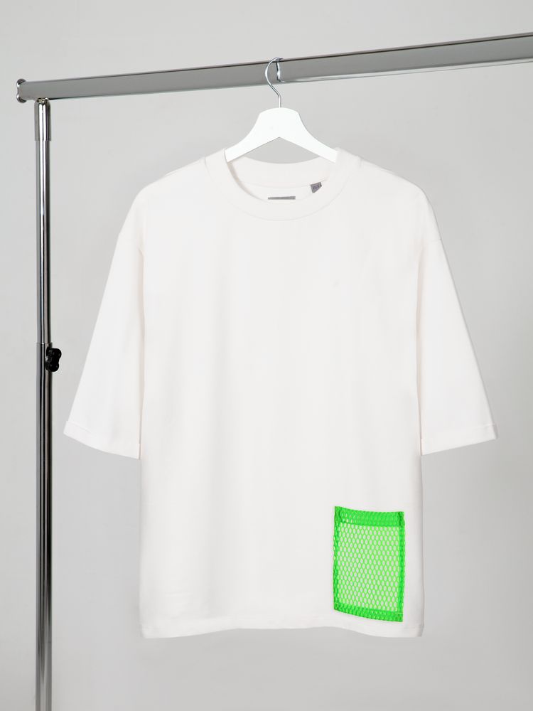 Футболка унисекс свободного кроя со спущенным плечом и смещенными плечевыми швами.