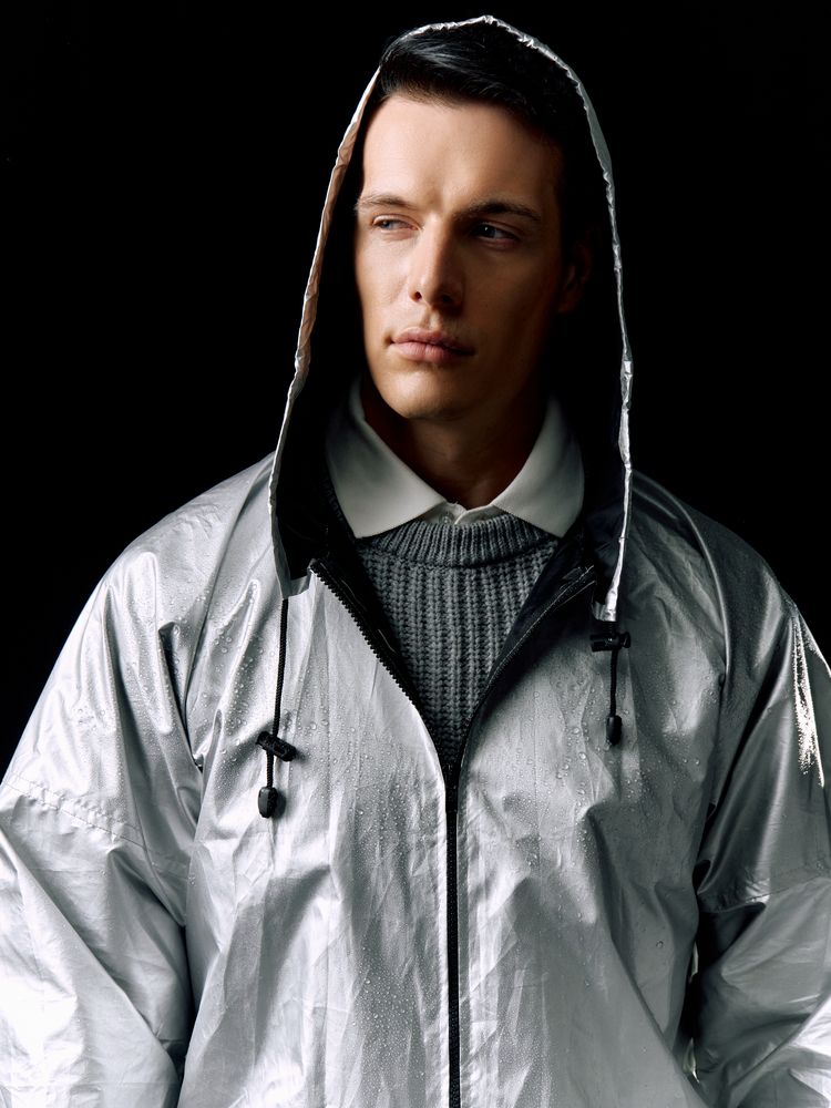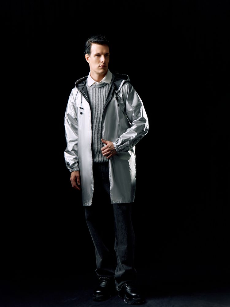 Плащ-дождевик из ткани таффета на молнии с капюшоном. Складывается в мешочек — удобно брать с собой.
