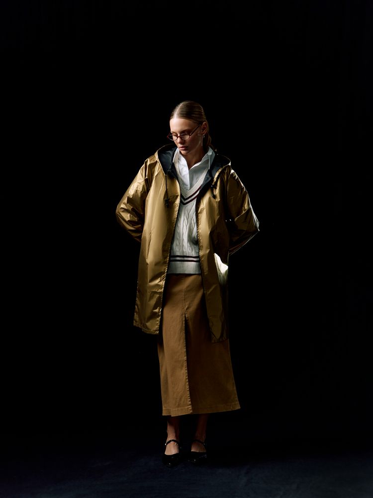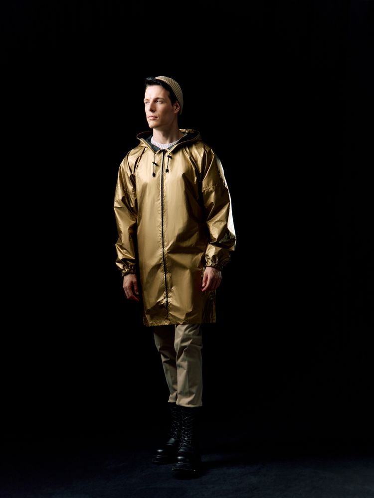 Плащ-дождевик из ткани таффета на молнии с капюшоном. Складывается в мешочек — удобно брать с собой.