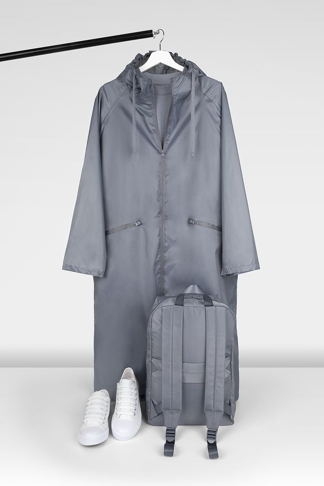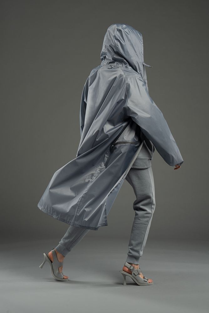 Плащ-дождевик на молнии с капюшоном из ткани таффета с полиуретановой пропиткой для защиты от сильного дождя.