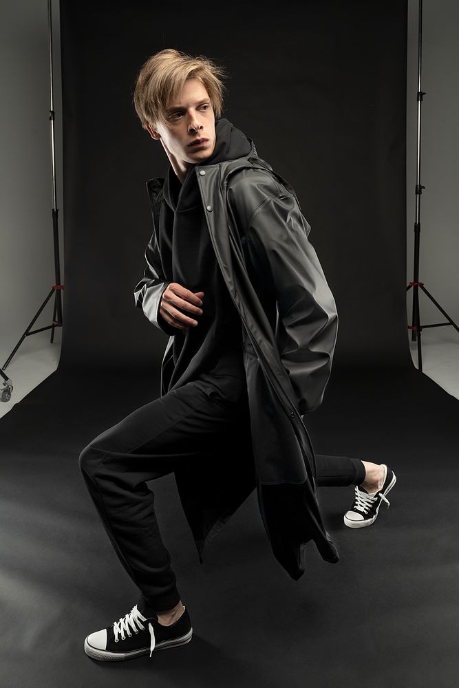 Плащ-дождевик с капюшоном из полиэстера с полиуретановым непромокаемым покрытием.