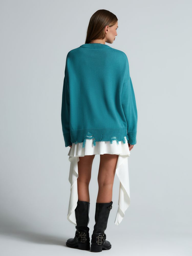 Модель: однотонный гладкий свитер унисекс, спущенное плечо. Ворот, манжеты и низ изделия вывязаны резинкой c добавлением эффекта «рваного» края.