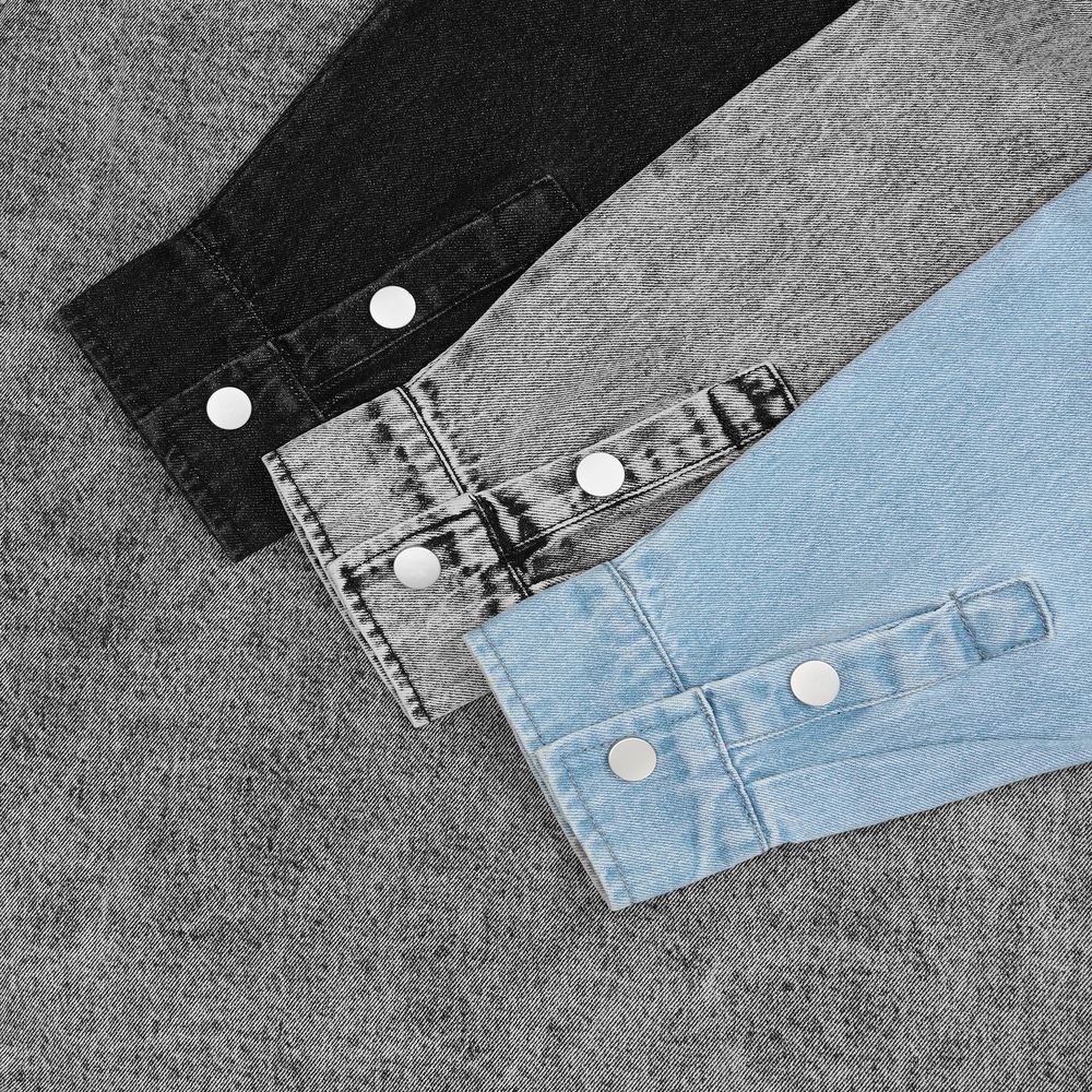 Джинсовая куртка-рубашка унисекс на кнопках прямого силуэта.