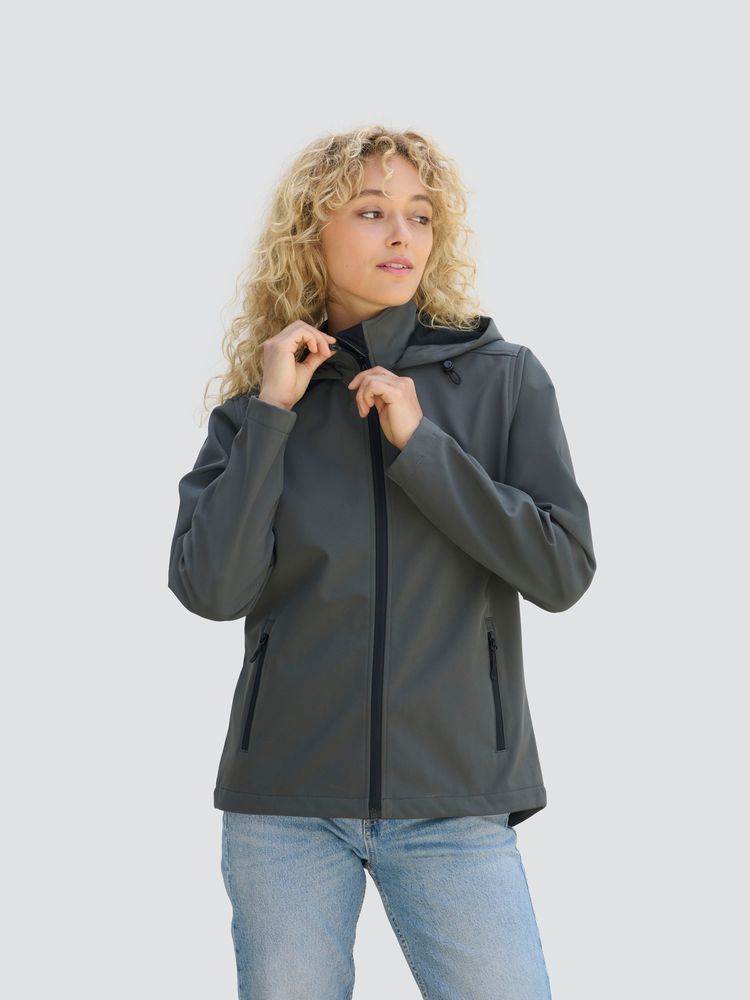 Женская куртка софтшелл на молнии и с капюшоном.
