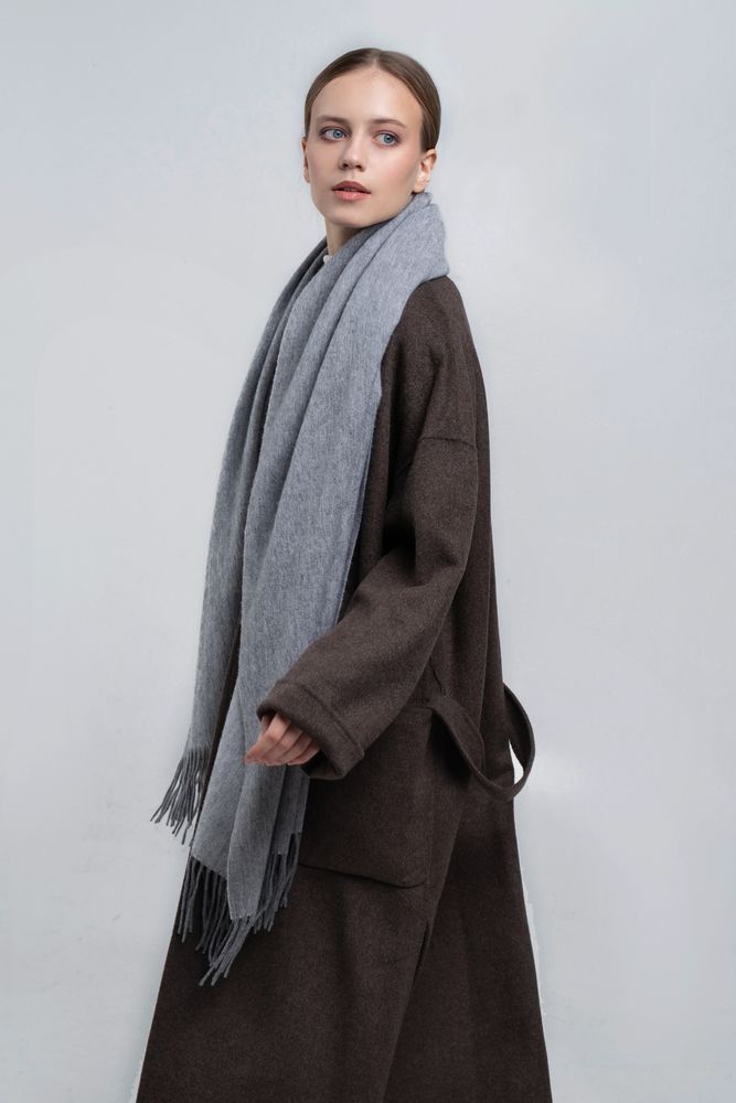Широкий палантин с едва заметным узором плетения открывает простор фантазии — его можно использовать как шарф, головной убор или декоративный элемент для верхней одежды.