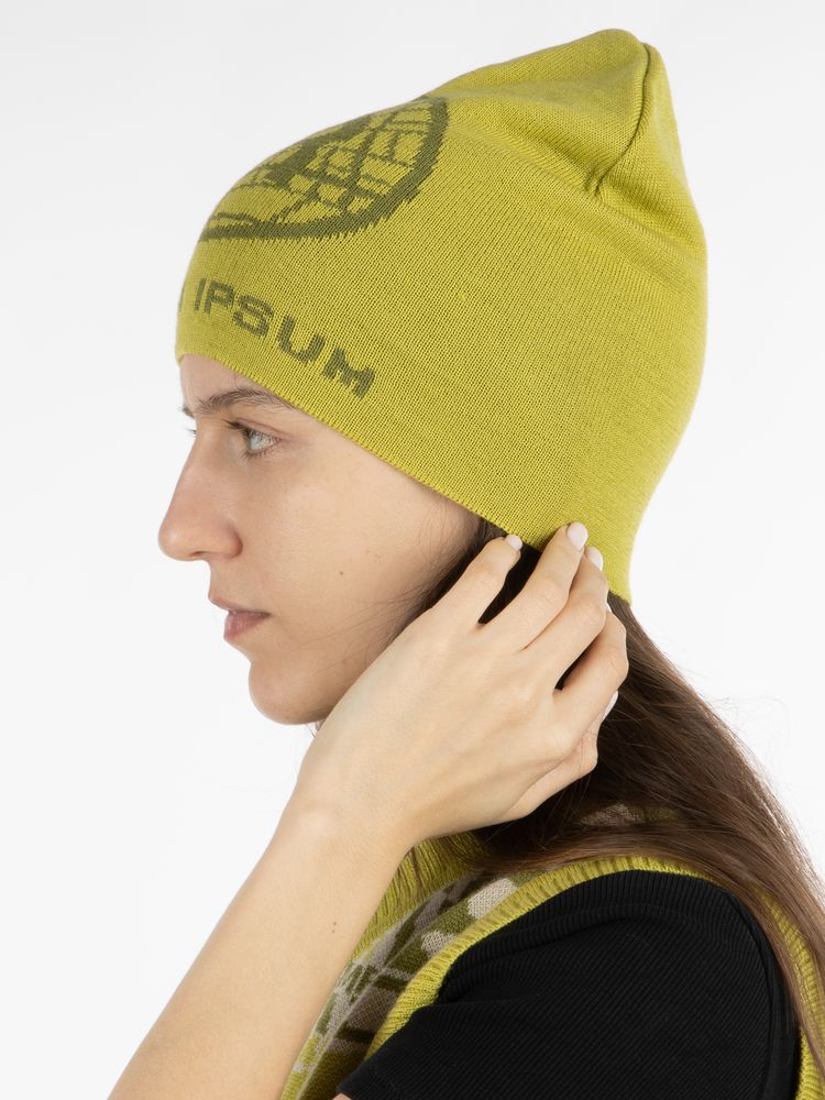 Модель: удлиненная однослойная шапка с жаккардовым узором в 2-3 цвета, без отворота, без помпона.