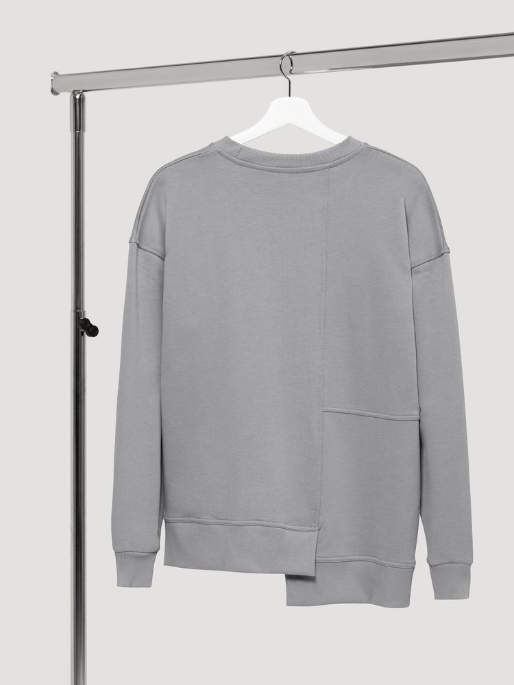Свитшот унисекс свободного кроя со спущенным плечом и нестандартным нижним краем.