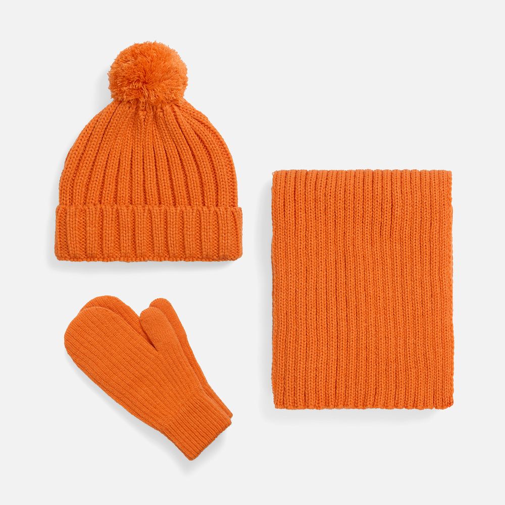 Шапка с пышным помпоном и отворотом, связанная крупной резинкой, создает игривый силуэт, а широкий шарф с выразительной текстурой надежно защищает от ветра, сохраняя свободу движений. Варежки с отворотом-резинкой плотно облегают запястье, не пропуская холод.