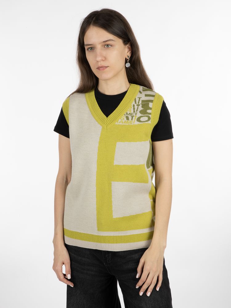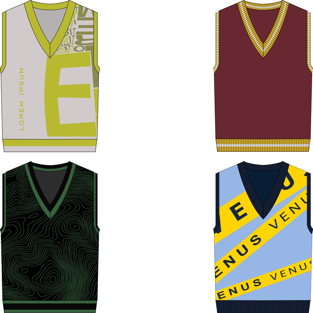 Модель: жилет жаккардовой вязки, плотный и теплый, 2–3 цвета нитей, гладкая поверхность. На бейках горловины и проймы возможна отделка в виде контрастных полос (не более 3-х цветов).