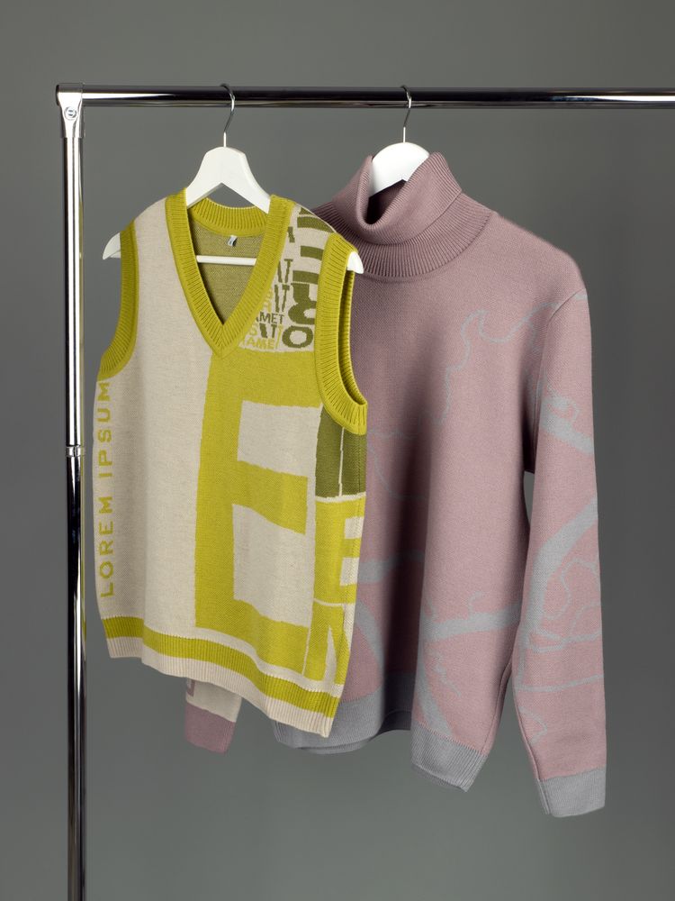 Модель: жилет жаккардовой вязки, плотный и теплый, 2–3 цвета нитей, гладкая поверхность. На бейках горловины и проймы возможна отделка в виде контрастных полос (не более 3-х цветов).