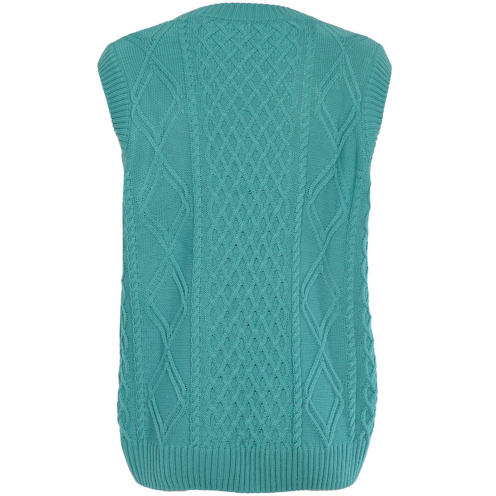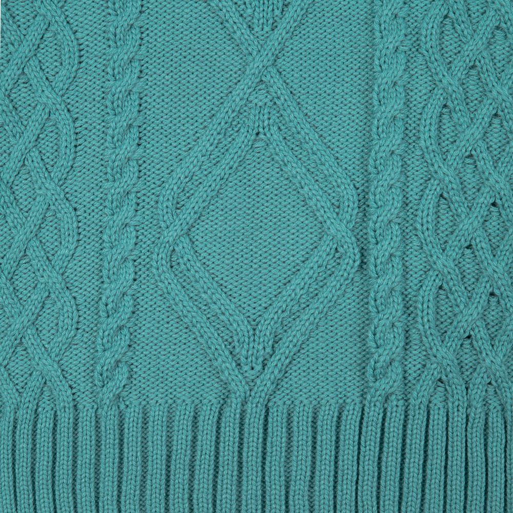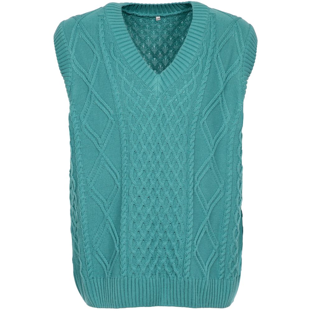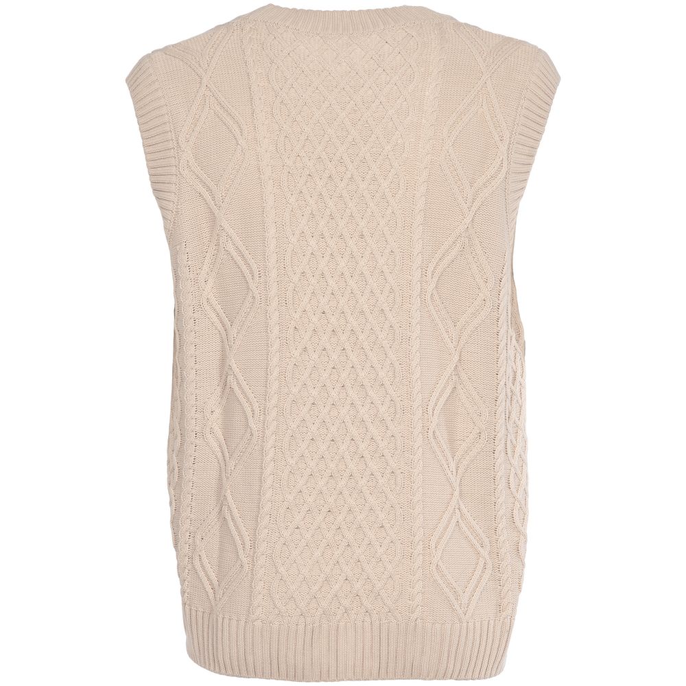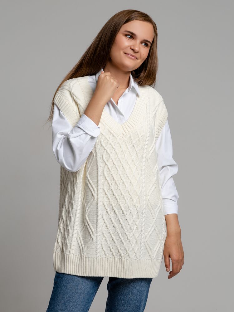 Модель: однотонный жилет крупной вязки с узорами в виде кос. Силуэт оверсайз, спущенное плечо.