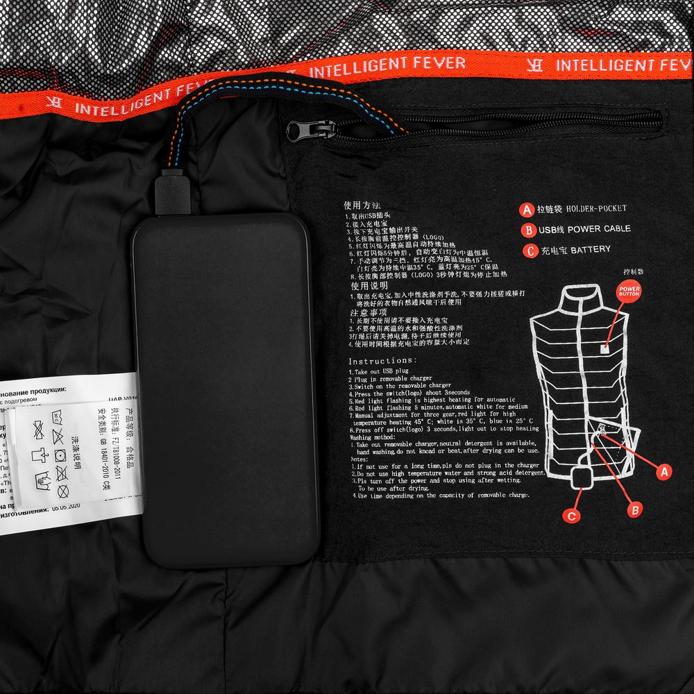 1. Подключите внешний аккумулятор к кабелю во внутреннем кармане куртки.