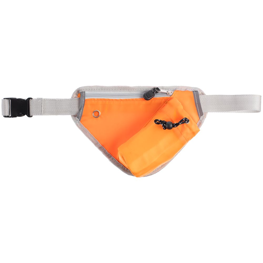 Сумка имеет внешний карман на молнии для хранения телефона и полезных мелочей и отделение со шнуром-фиксатором под бутылку для воды диаметром до 7 см. Ремень выполнен из прочной регулируемой стропы. Светоотражающие детали помогут оставаться заметными во время тренировок в сумерках и темноте.