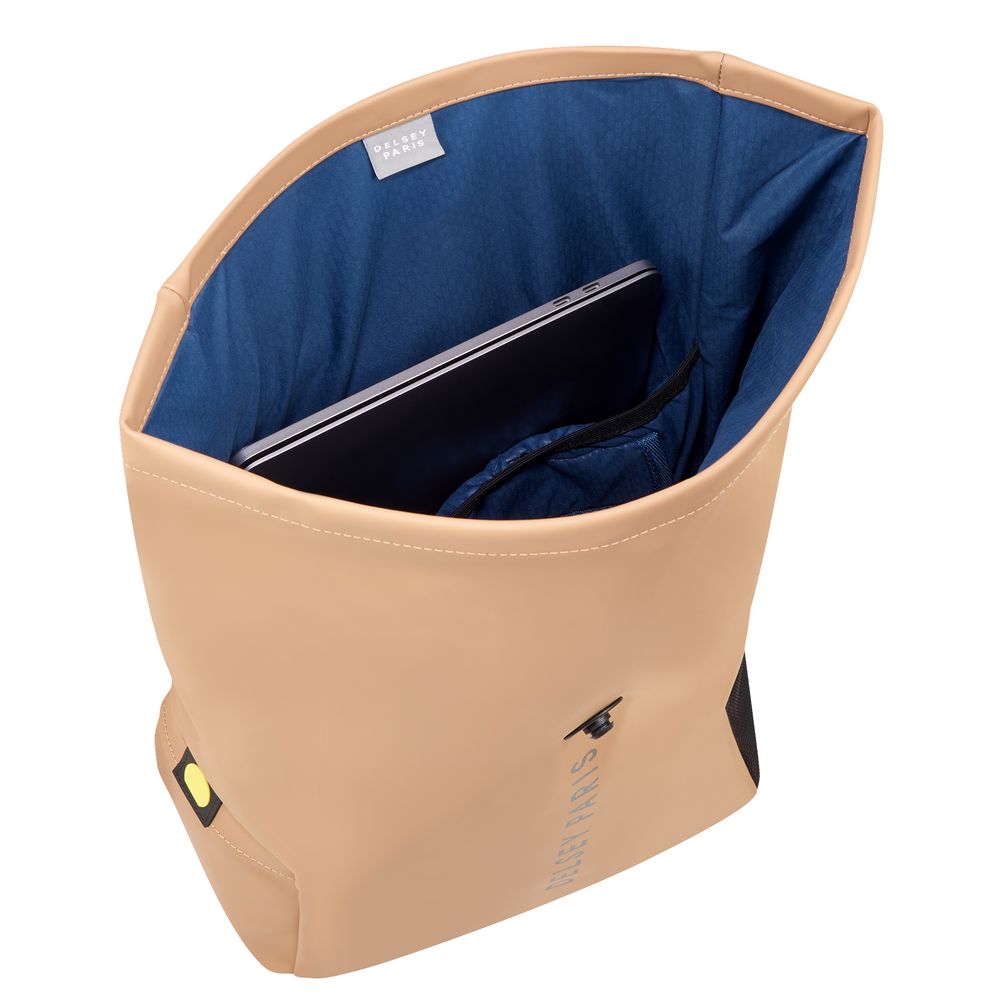 Вместимость рюкзака можно адаптировать благодаря застежке роллтоп: соедините магниты, заверните часть, оставшуюся свободной, и закрепите ее с помощью зажима.