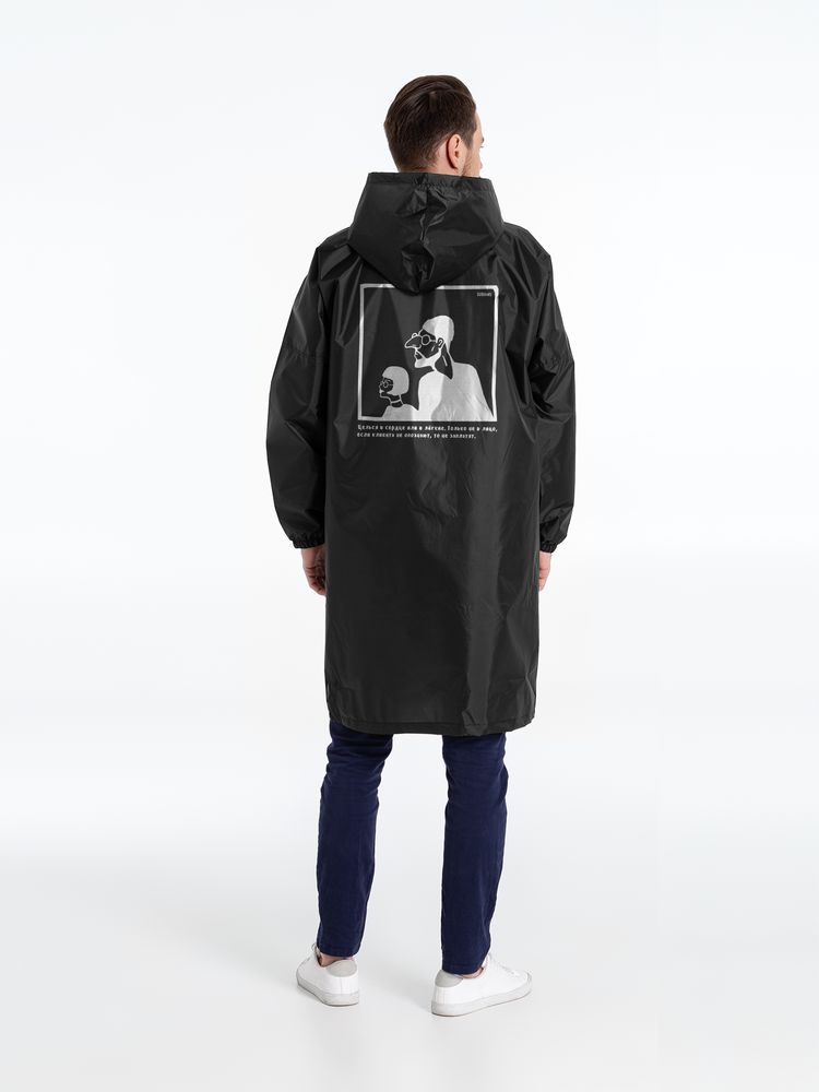 Дизайн принта: Яков Коган.Плащ-дождевик из ткани таффета на молнии с капюшоном. Складывается в мешочек — удобно брать с собой.