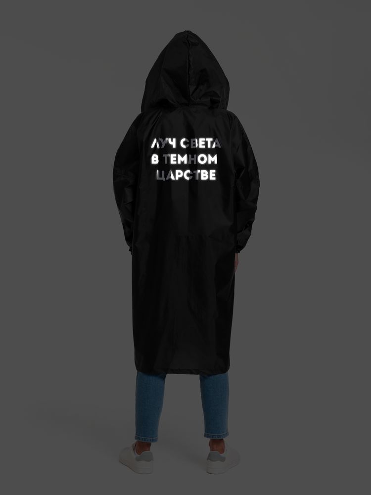 Плащ-дождевик из ткани таффета на молнии с капюшоном. Складывается в мешочек — удобно брать с собой.